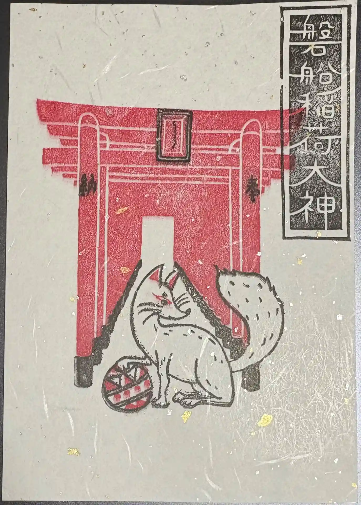 磐船稲荷神社の御朱印には鳥居と手毬で遊ぶ狐が描かれています。