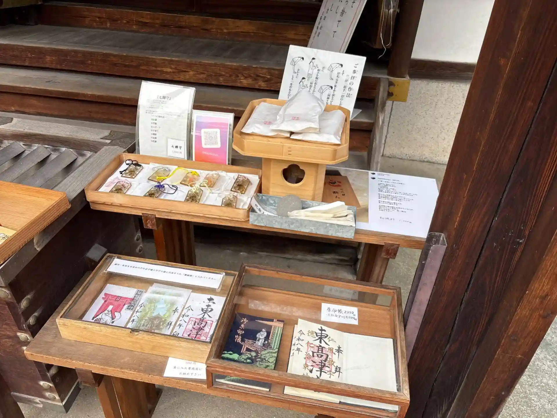 拝殿の前にセルフの授与所があります。御朱印帳もセルフでお受けできます。