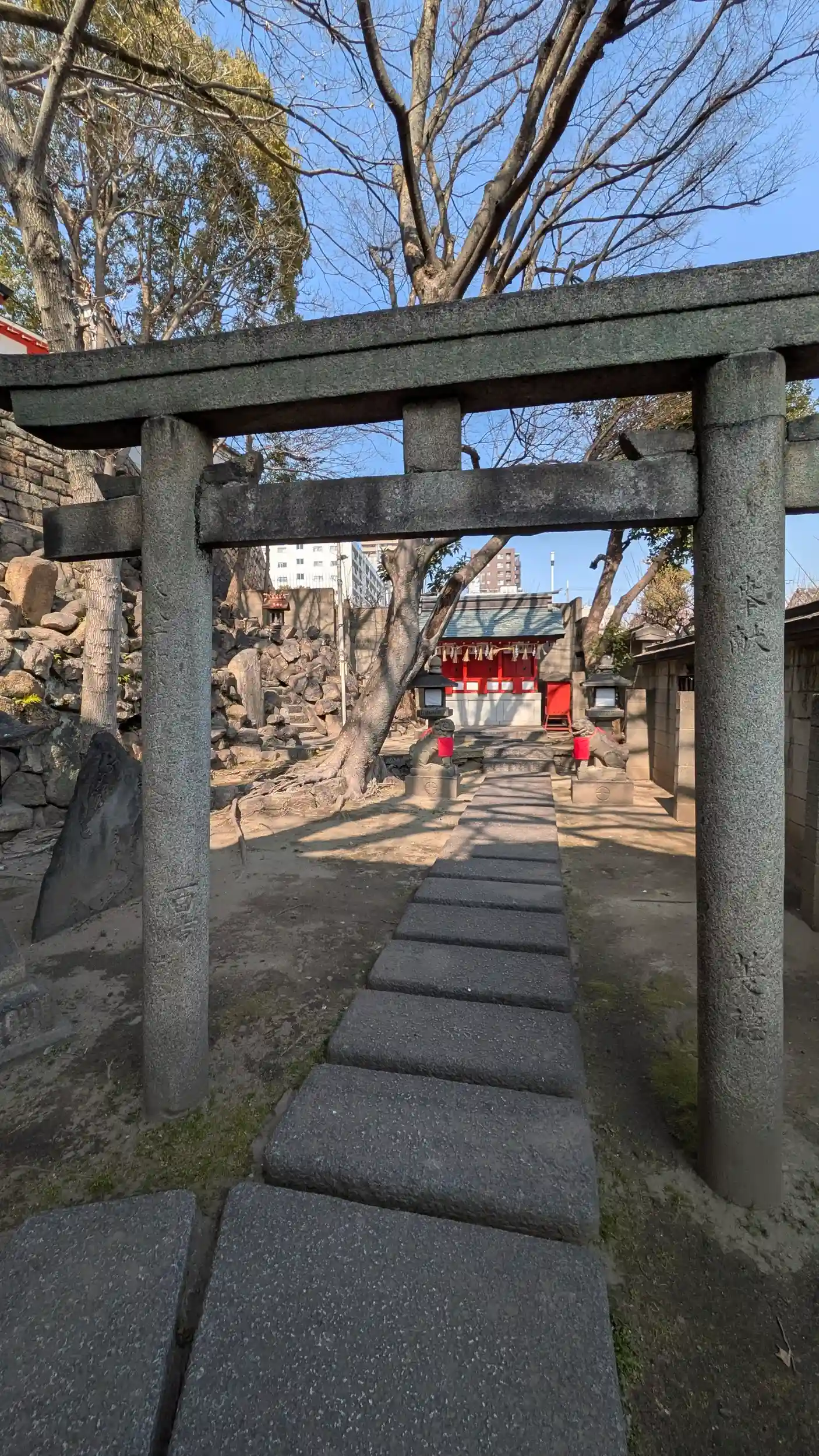 鳥居。奥に社殿 道頓堀の開発者の一人である安井九兵衛の日本橋北詰の屋敷にあったお稲荷さん
