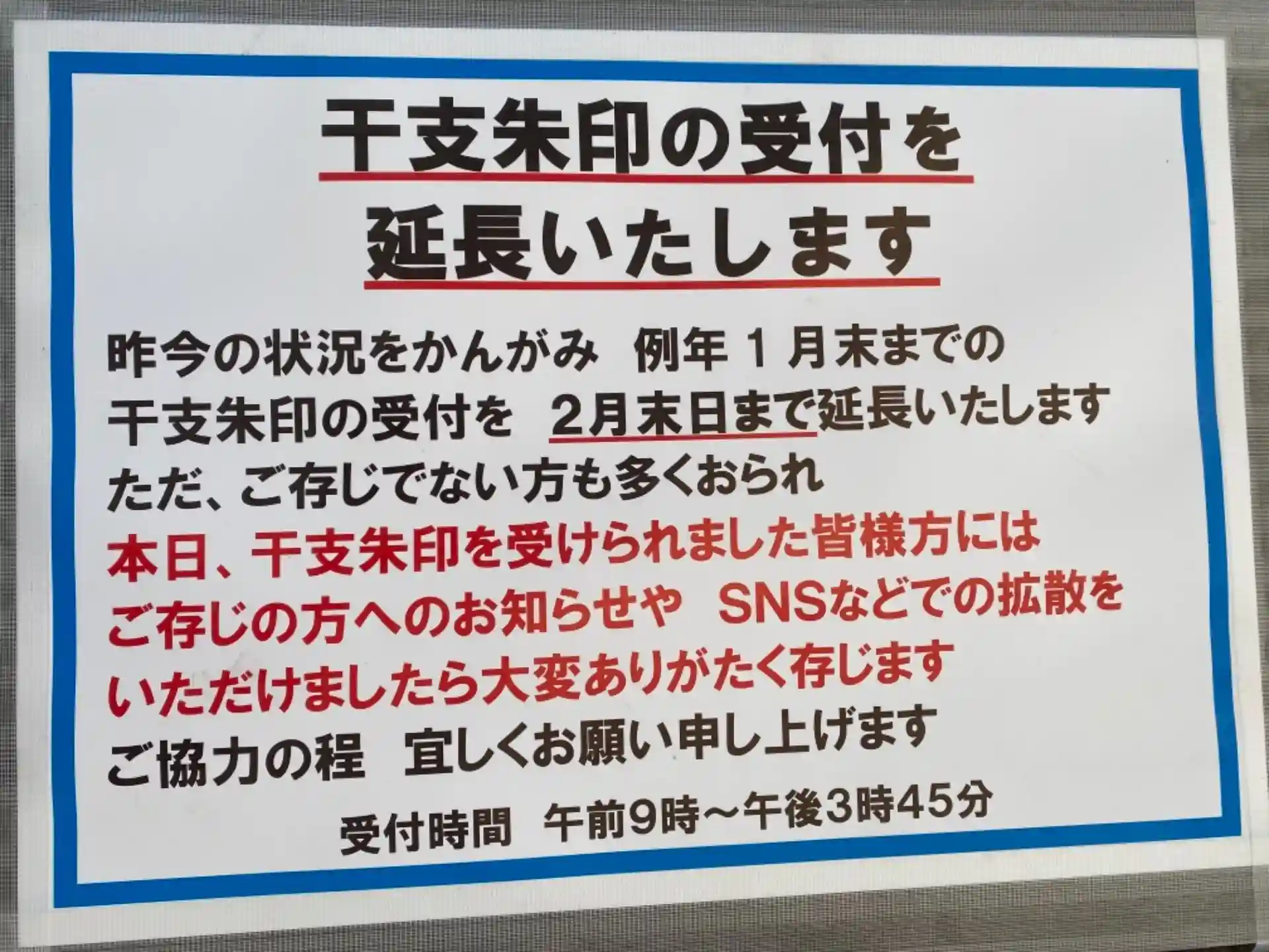 1月の干支の限定の御朱印いただいてきました。通常は1月中のみですが昨今の状況を鑑み、2月末まで延長されるそうです。また閉門も16時までのようですのでお参りされる際はご参考に頂ければ。