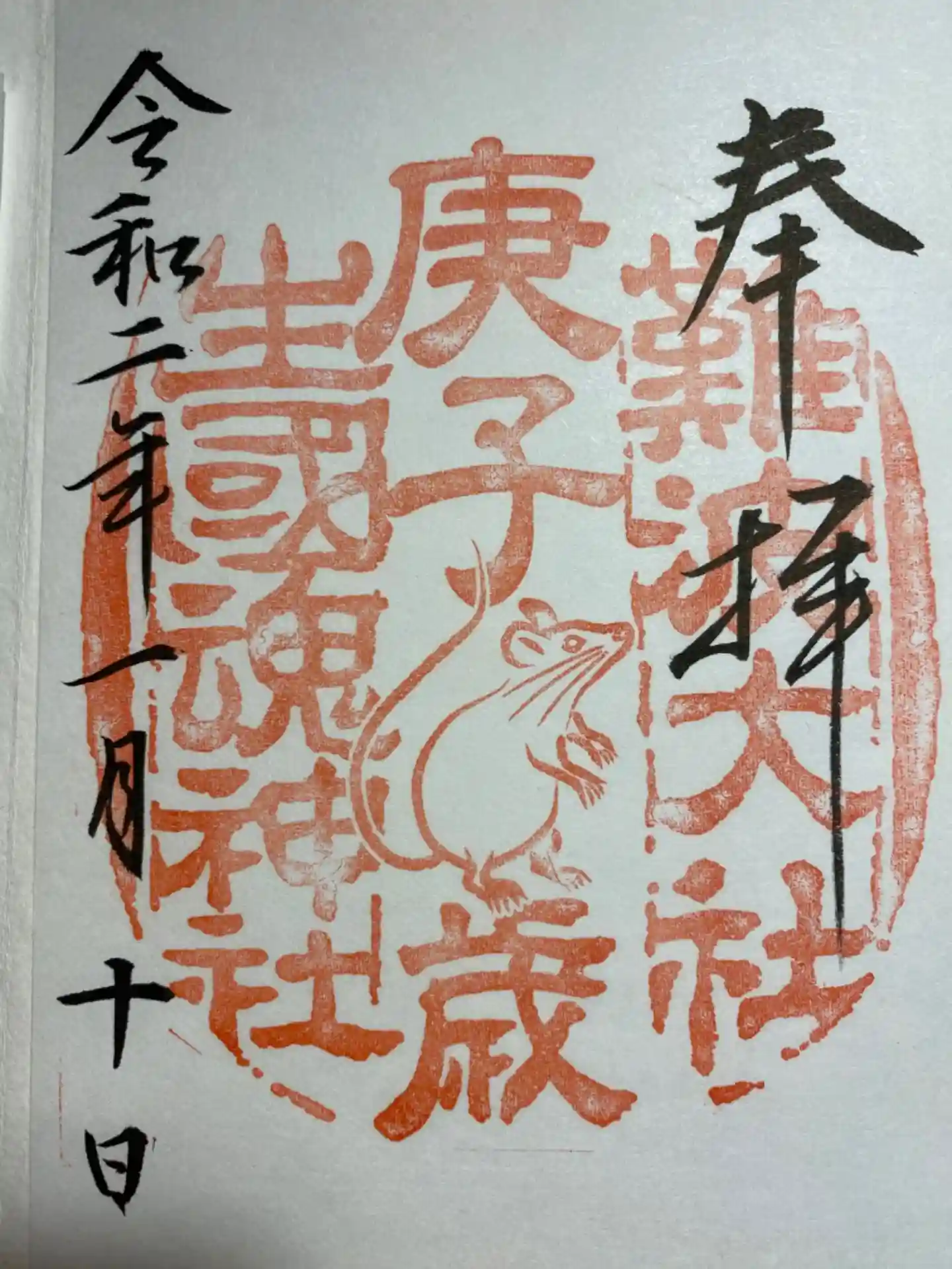 今年は「庚子」(かのえね)となるため、生國魂神社では、60年毎にしか使われていない朱印を使うため、全国から、毎年お正月(1月中)にこの御朱印を求めて、参拝客が訪れるそうです。