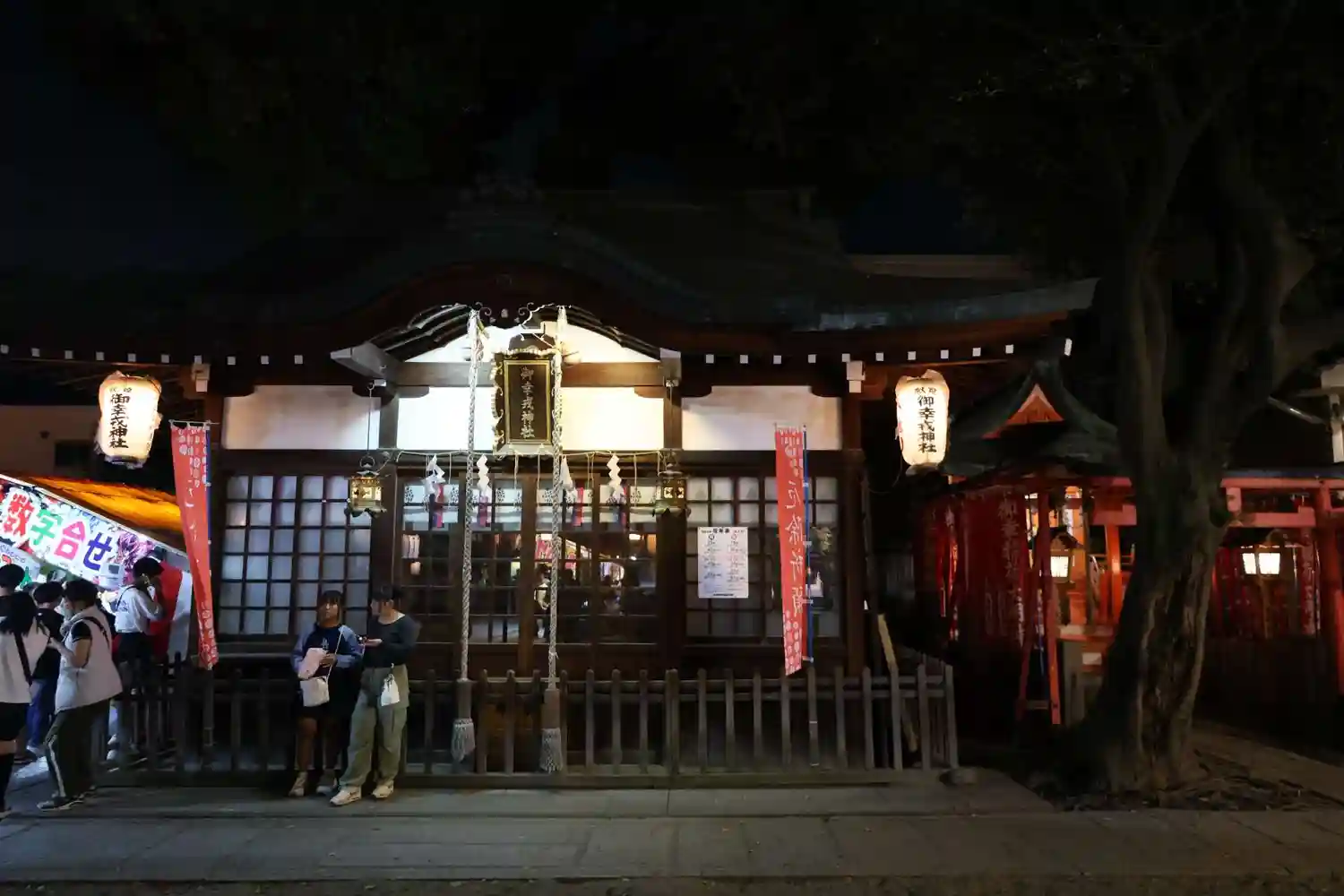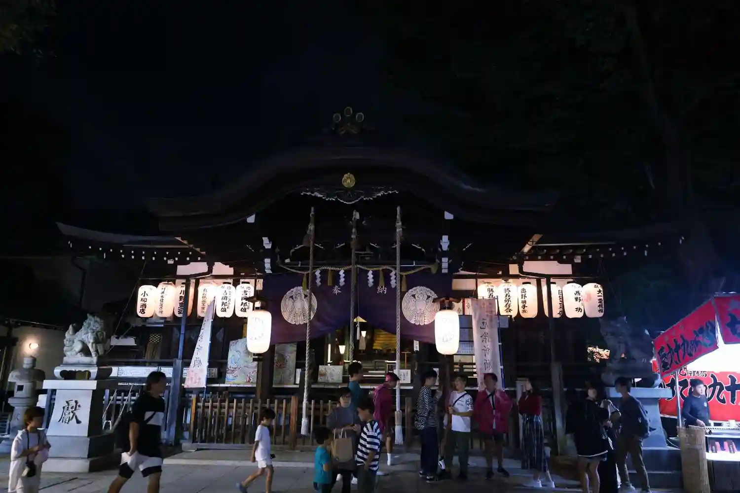 鳥居横の狛犬の前に屋台が設置されています。