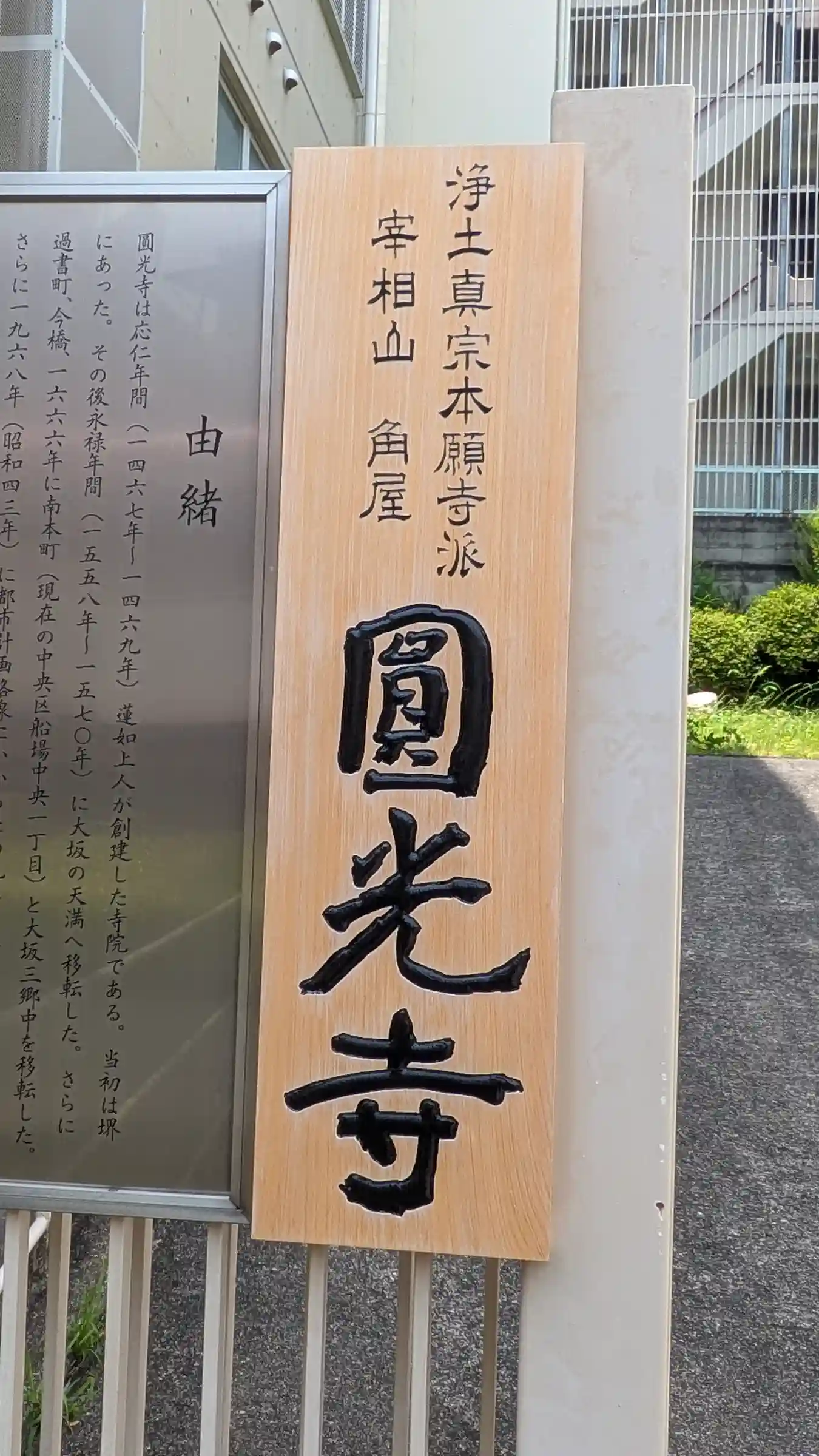 | ご由緒 | 圓光寺は応仁年間(1467-1469年)蓮如上人が創建した寺院である。当初は堺にあった。その後永禄年間(1558-1570年)に大坂の天満へ移転した。さらに過書町、今橋、1666年に南本町(現在の中央区船場中央1丁目)と大坂三郷中を移転した。さらに1968年(昭和43年)に都市計画路線にかかるため現在の天王寺区玉造の地に寺院を移した。