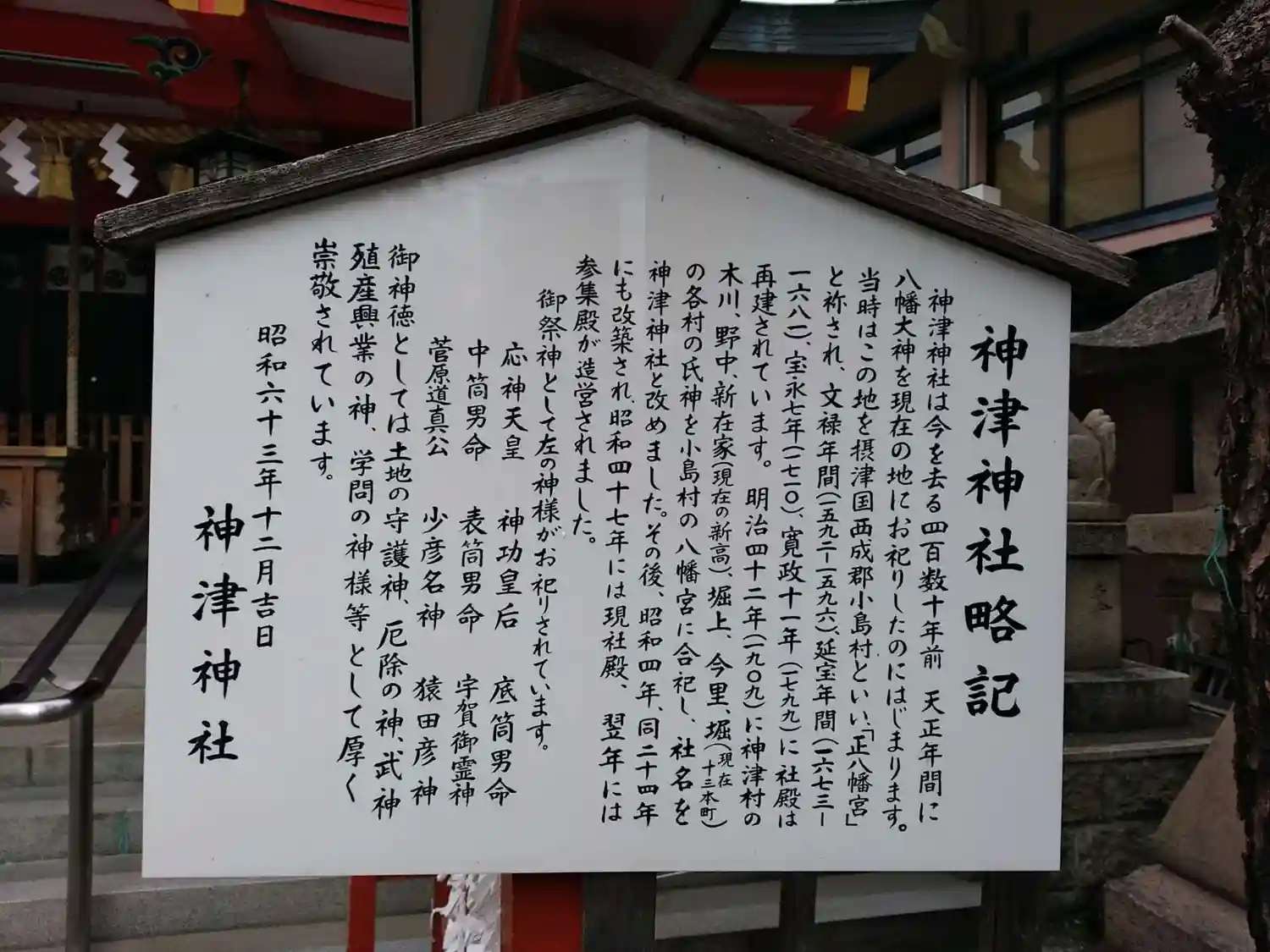 | ご祭神 | 《主》応神天皇,神功皇后,底筒男命,中筒男命,表筒男命,宇賀御霊神,菅原道真,少彦名神,猿田彦神 | |