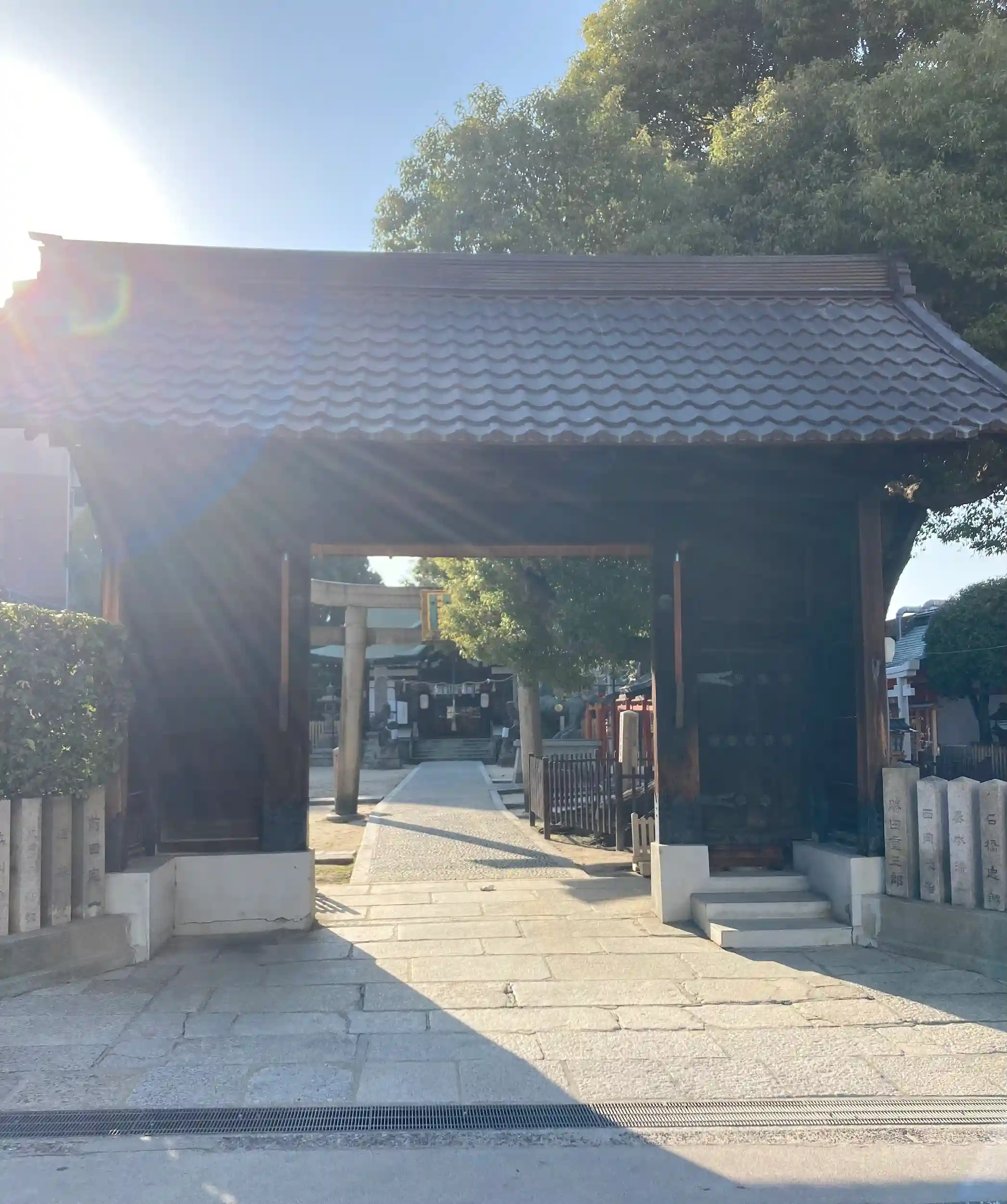 お寺の三門のような門の奥に鳥居。