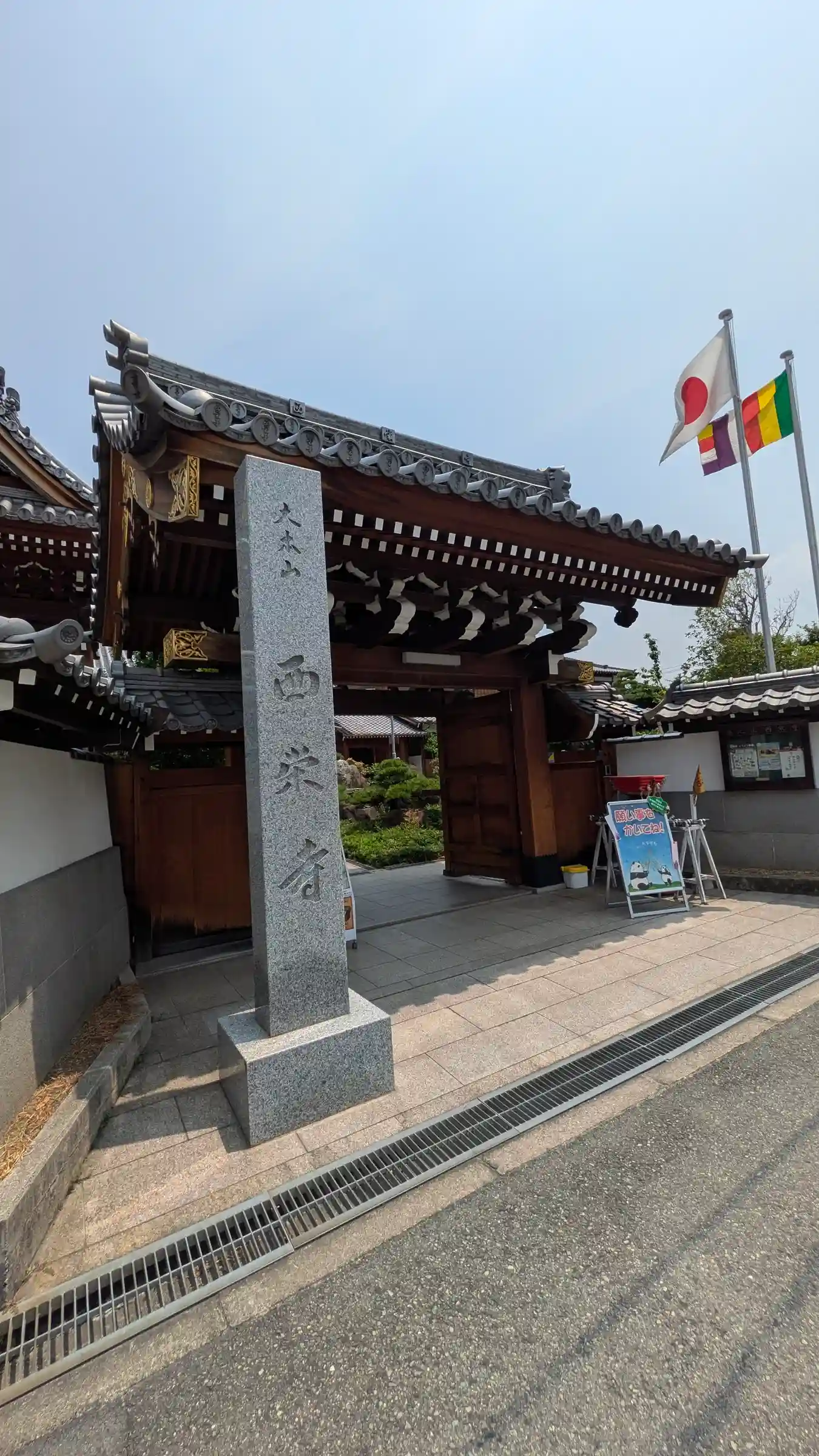 山門。寺号標には「大本山西栄寺」