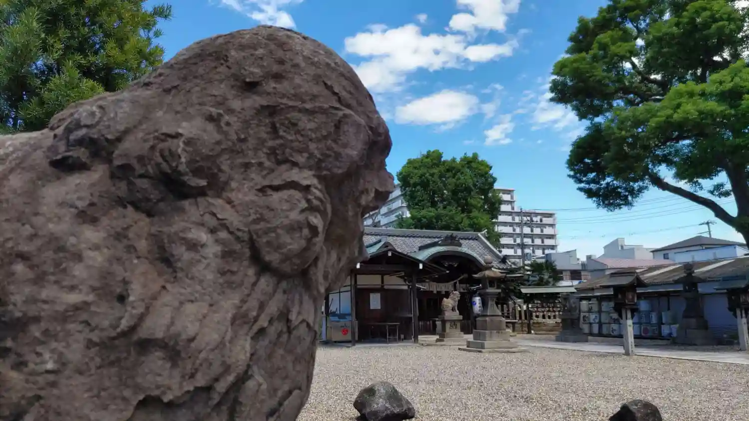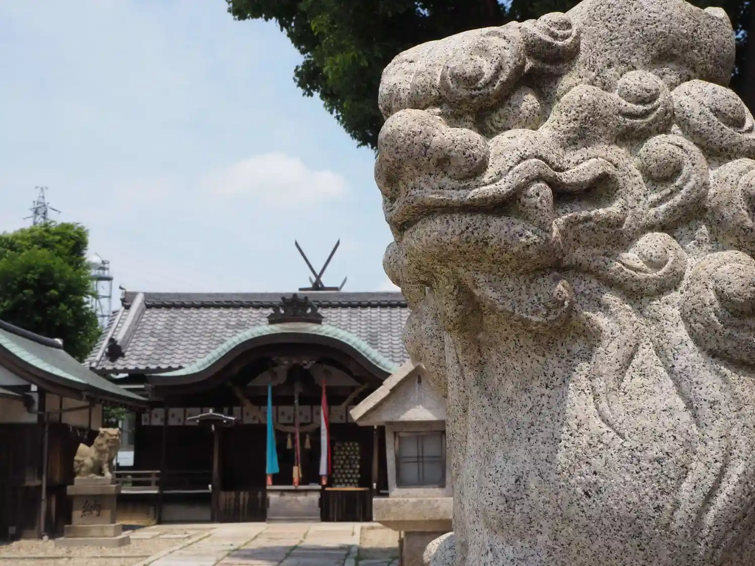 社殿のこの感じがなごみます。朔日はカラフルになる狛犬さんも。