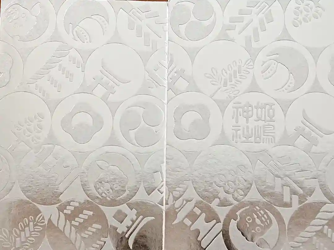 ひらがなの間に神紋や神具の絵が円の中に描かれ、更に授与される月に合わせたモチーフ(植物や縁起物等)が描かれています。。