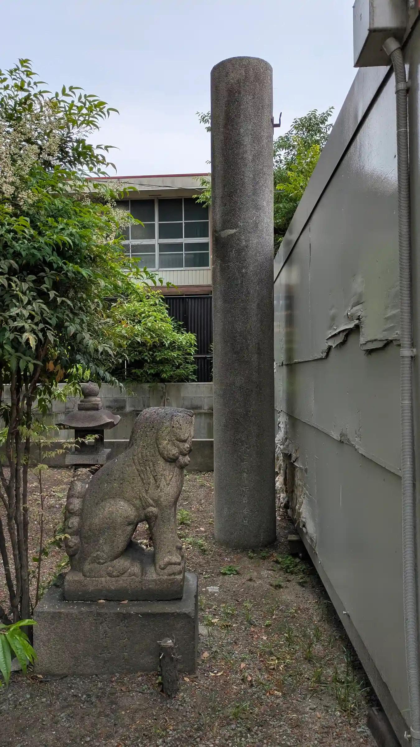 コンテナと狛犬に鳥居跡らしき柱