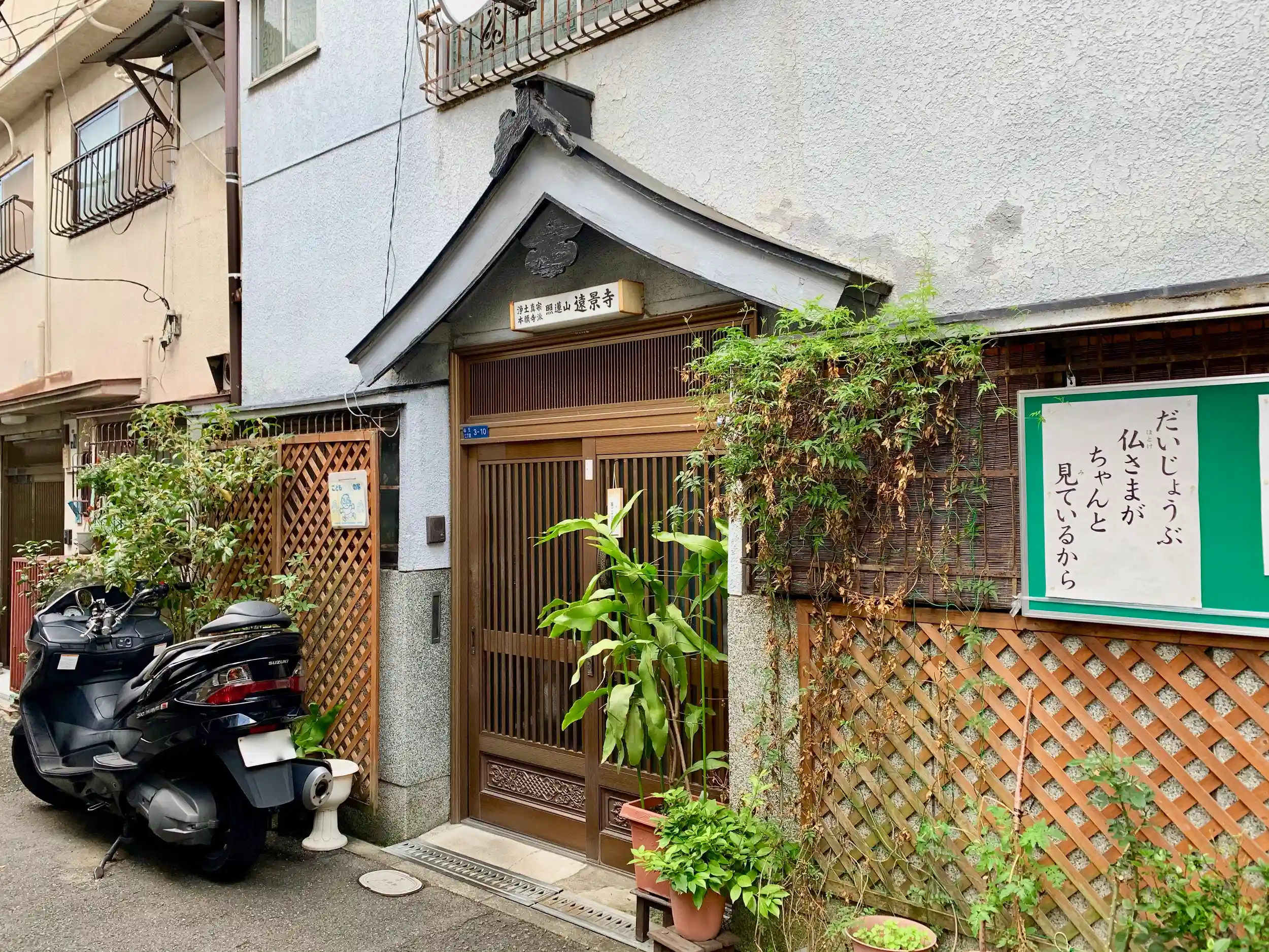 玄関の上に「浄土真宗本願寺派照遠山 遠景寺」と書かれている。横に掲示板。