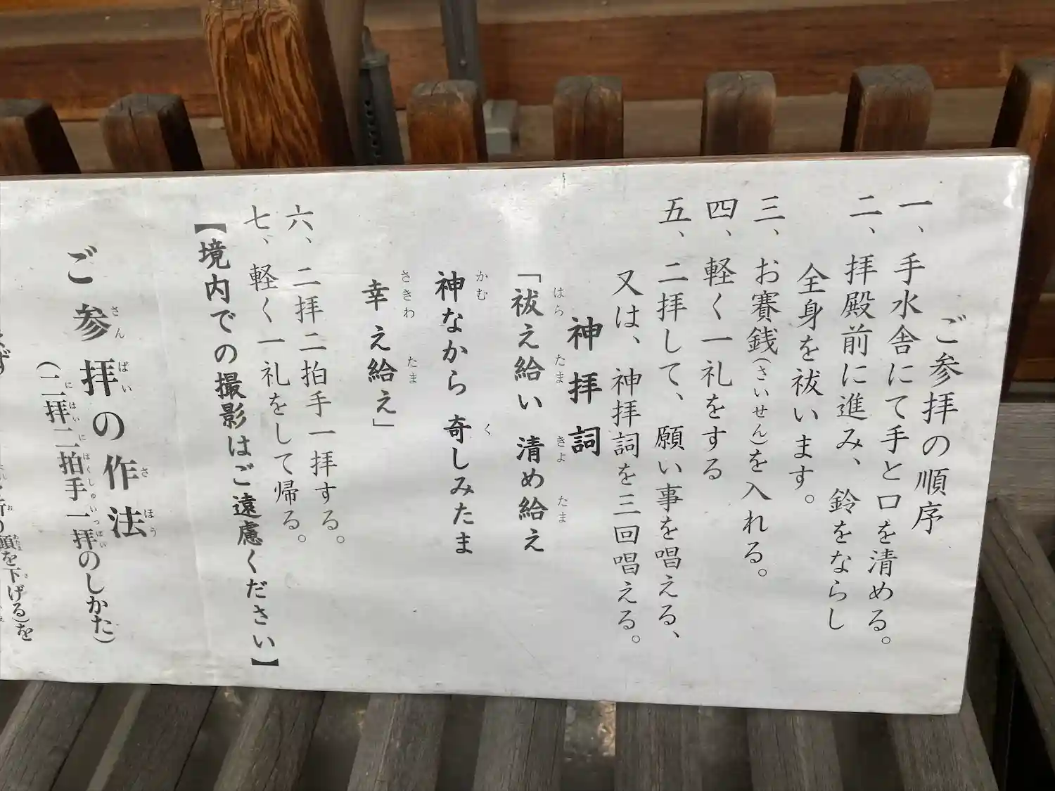 こちらも本殿&境内は撮影禁止なので、正門の外からと、御由緒と参拝方法が詳しかったので、そこだけ撮影しました。