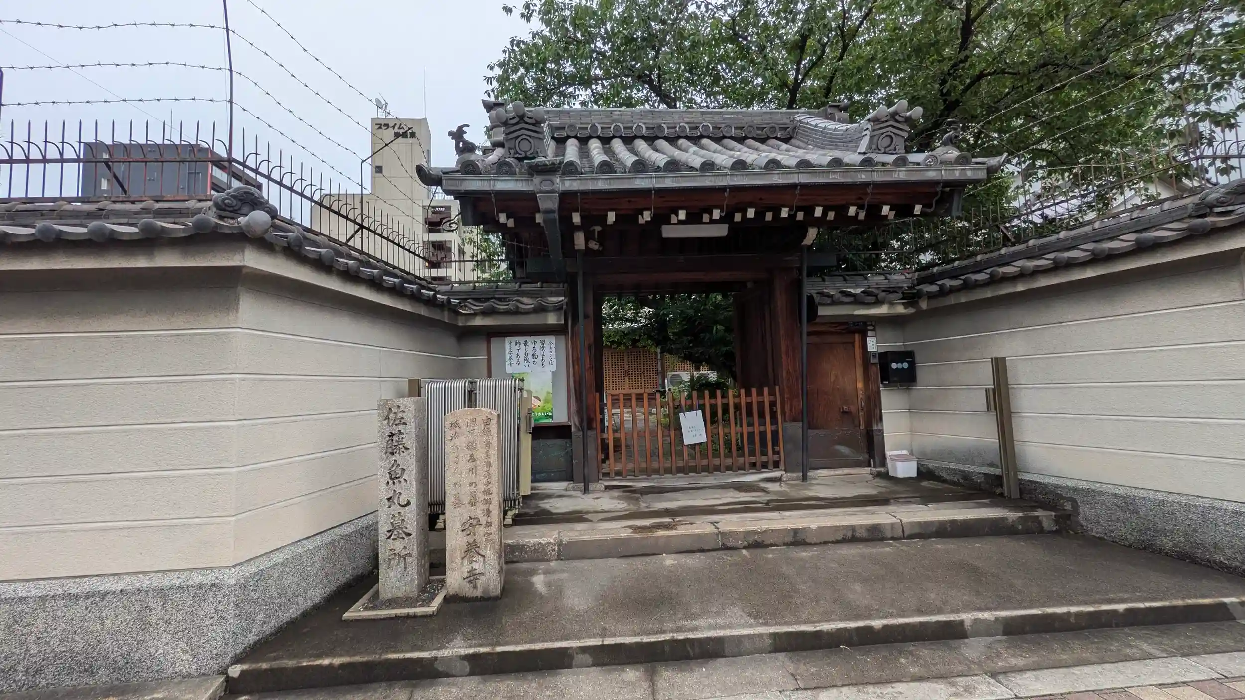 天下茶屋公園の東にあったのでお詣り。山門前の石碑には佐藤魚丸(狂歌師)、紙治おさん(近松門左衛門の浄瑠璃『心中天網島』の主人公である紙屋治兵衛の妻「おさん」)、関取猪名川の墓とある。仕事前参拝なので門前での合掌。