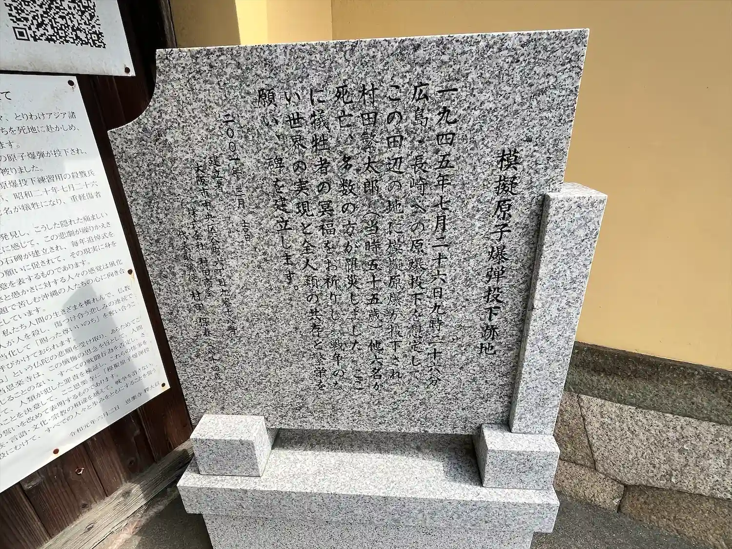 山門前の「模擬原子爆弾投下」の碑。