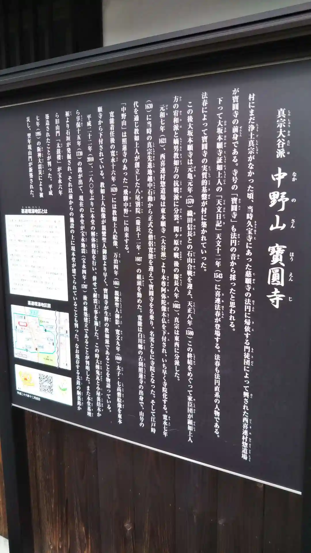 | ご由緒 | 村にまだ浄土真宗がなかった頃、当時久宝寺にあった慈願寺の法円に帰依する門徒団によって起された西喜連村惣道場が寶圓寺の前身である。寺号の「寶圓寺」も法円の音から採ったと思われる。