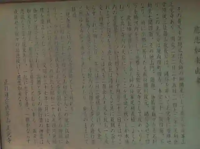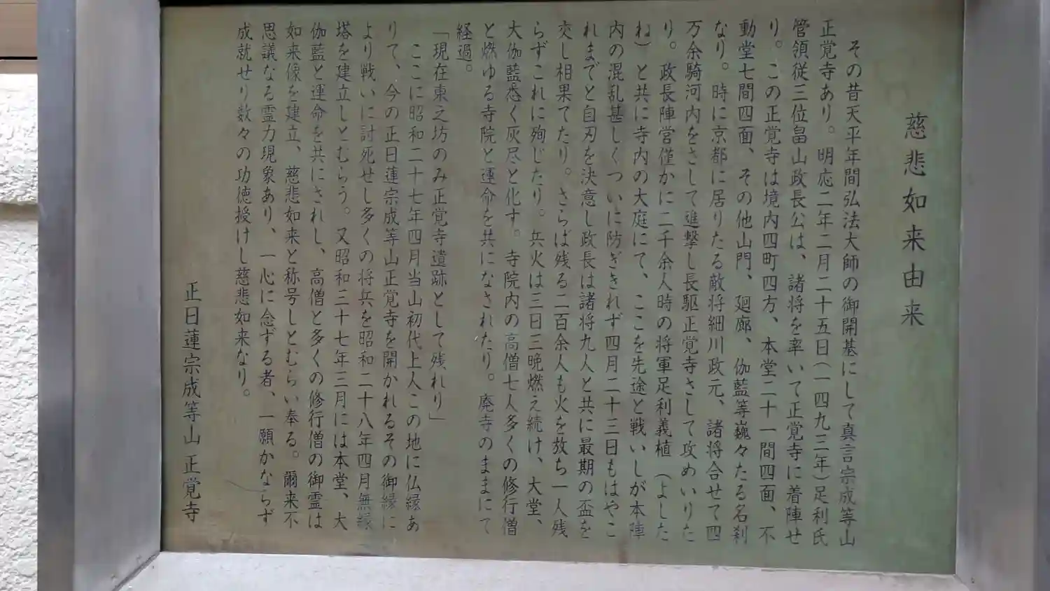 ここに昭和27年4月当山初代上人この地に仏縁ありて、今の成等山正覚寺を開かれるその御縁により戦いに討死にせし多くの将兵を昭和28年4月無縁塔を建立しとむらう。又昭和37年3月には本堂、大伽藍と運命を共にされし、高僧と多くの修行僧の御霊は如来像を建立、慈悲如来と称号しとむらい奉る。爾来不思議なる霊力現象あり、一心に念ずる者、一願かならず成就せり数々の功徳授けし慈悲如来なり。