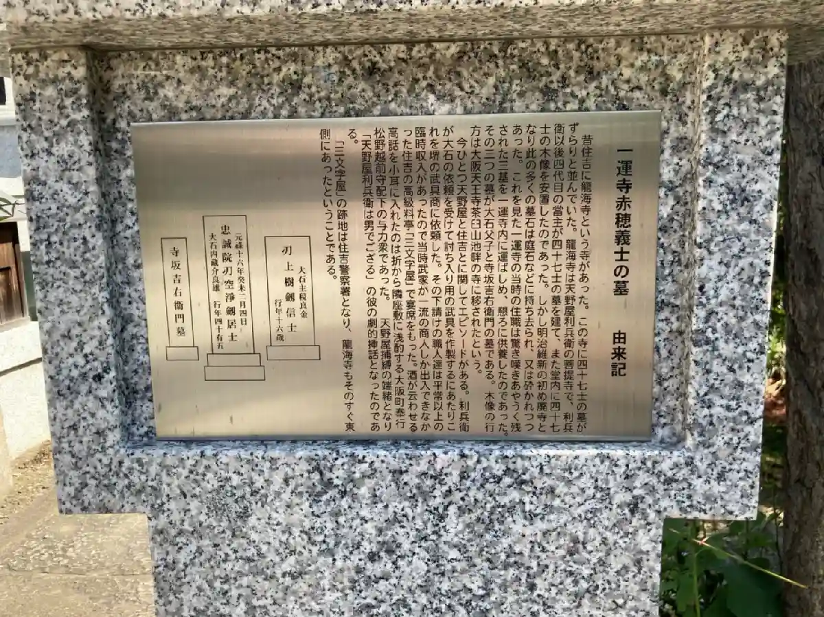 境内には赤穂義士四十七士の内、大石父子と寺坂吉右衛門の三基の墓がある。