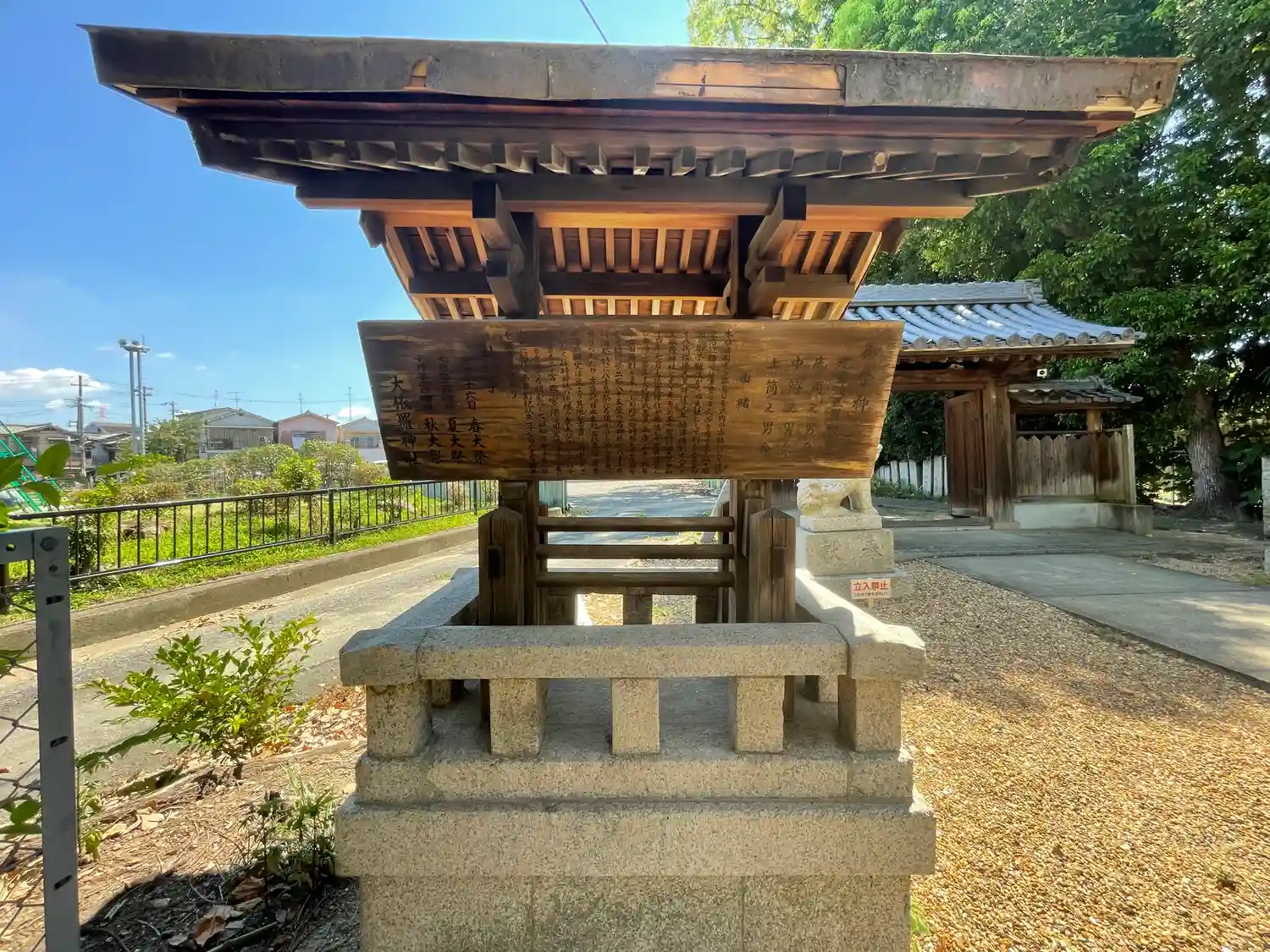 南側の門と社号標。