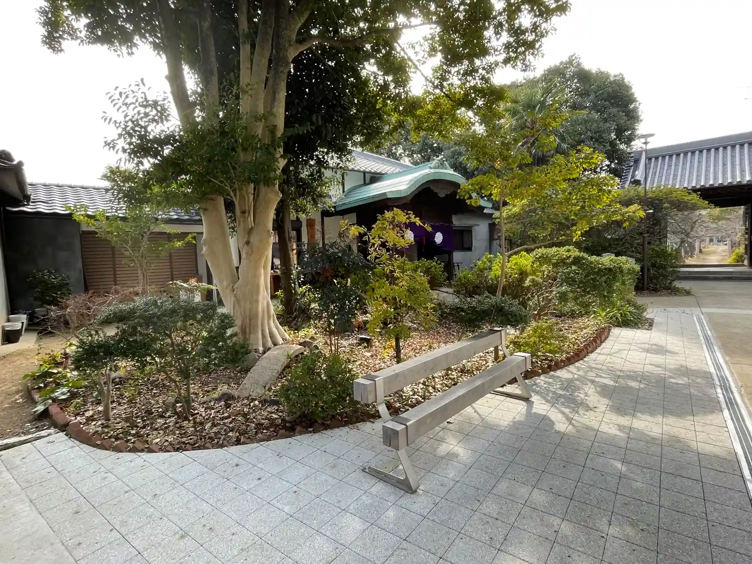 社務所前に御神木や神殿を眺められるベンチ❣️
