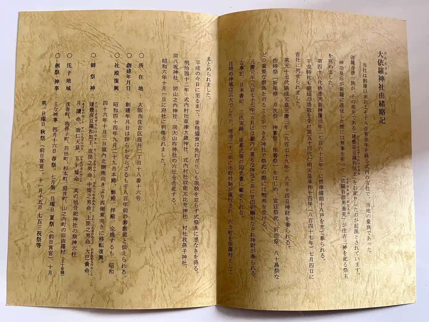 創建1800有余年を遡る『古事記』・『日本書紀』・『三代実録』・『延喜式』等の国史書に記載されている式内の古社で、当地の豪族であった依羅吾彦一族が、その祖先である第9代開化天皇の第四皇子「建豊波豆羅和気王(たけとよはずらわけのきみ)」をお祀りしたのが起源だそうです。