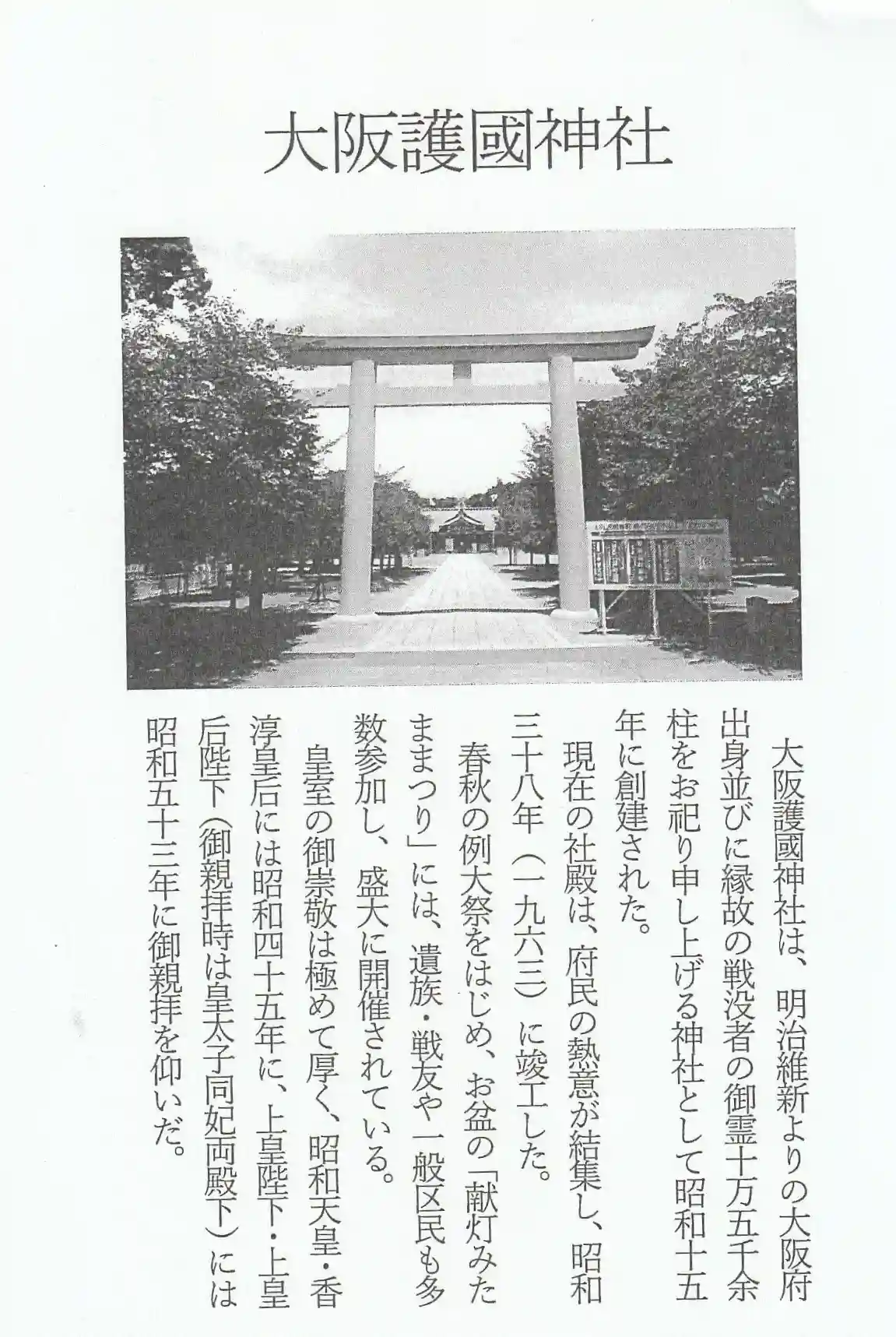 当大阪には、戦歿者の御霊を恒久的に奉斎する神社がなかったため、支那事変を契機に、府民の間から朝夕英霊にいつでも参拝し、その勲功を常に顕彰申し上げたいとの機運が澎湃としておこってきたため、時の大阪府知事が奉賛会長に就任し、内務大臣指定の護國神社として昭和十五年に創建された。