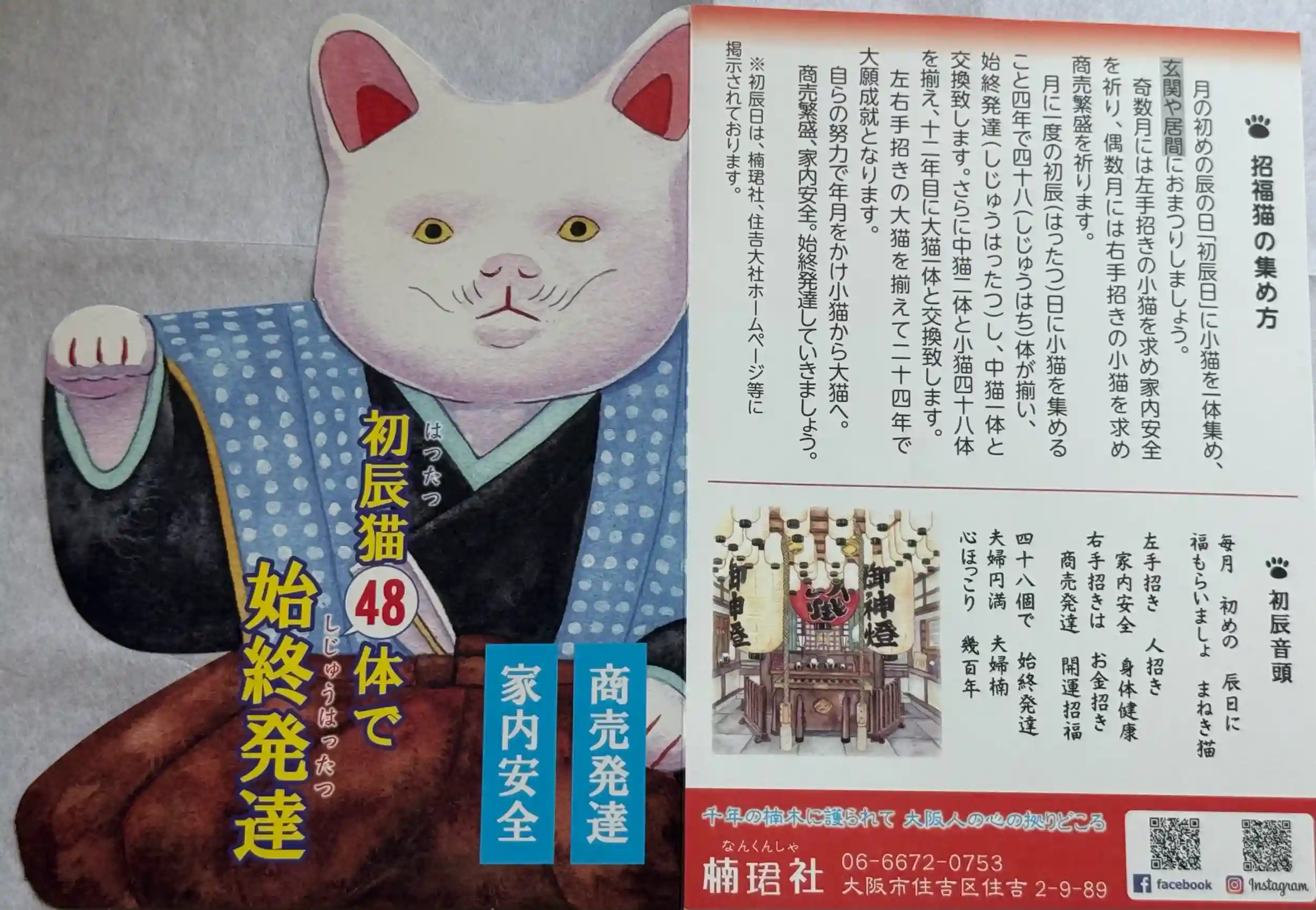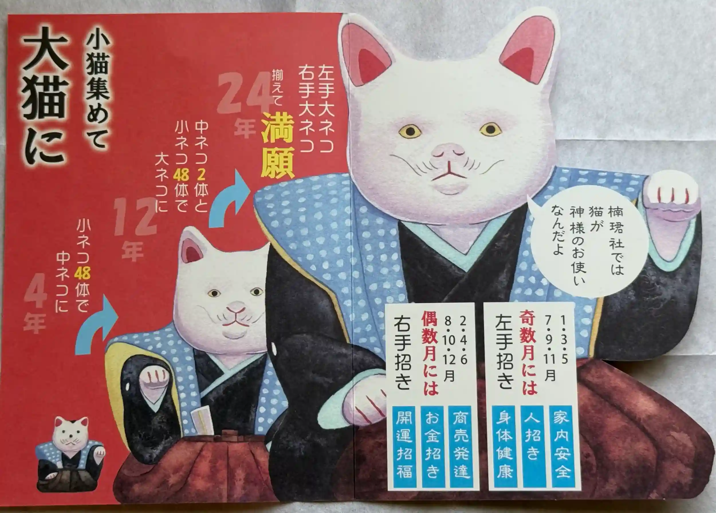 月の初めの辰の日「初辰日」に小猫を1体集め、玄関や居間におまつりしましょう。 奇数月には左手招きの小猫を求め家内安全を祈り、偶数月には右手招きの小猫を求め商売繁盛を祈ります。 月に一度の初辰(はったつ)日に小猫を集めること4年で48(しじゅうはち)体が揃い、始終発達(しじゅうはったつ)し、中猫1体と交換いたします。さらに中猫2体と小猫48体を揃え、12年目に大猫1体と交換いたします。 左右手招きの大猫を揃えて24年で大願成就となります。自らの努力で年月をかけ小猫から大猫へ。商売繁盛、家内安全。終始発達していきましょう。