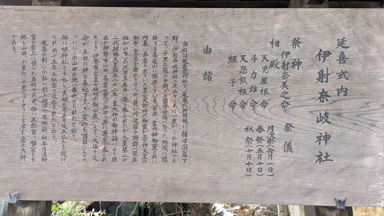 「伊射奈岐神社 一座」と書かれています。『延喜式』神名帳には「二座」と載っていることから、御祭神が分かれて祀られていることを示しています。