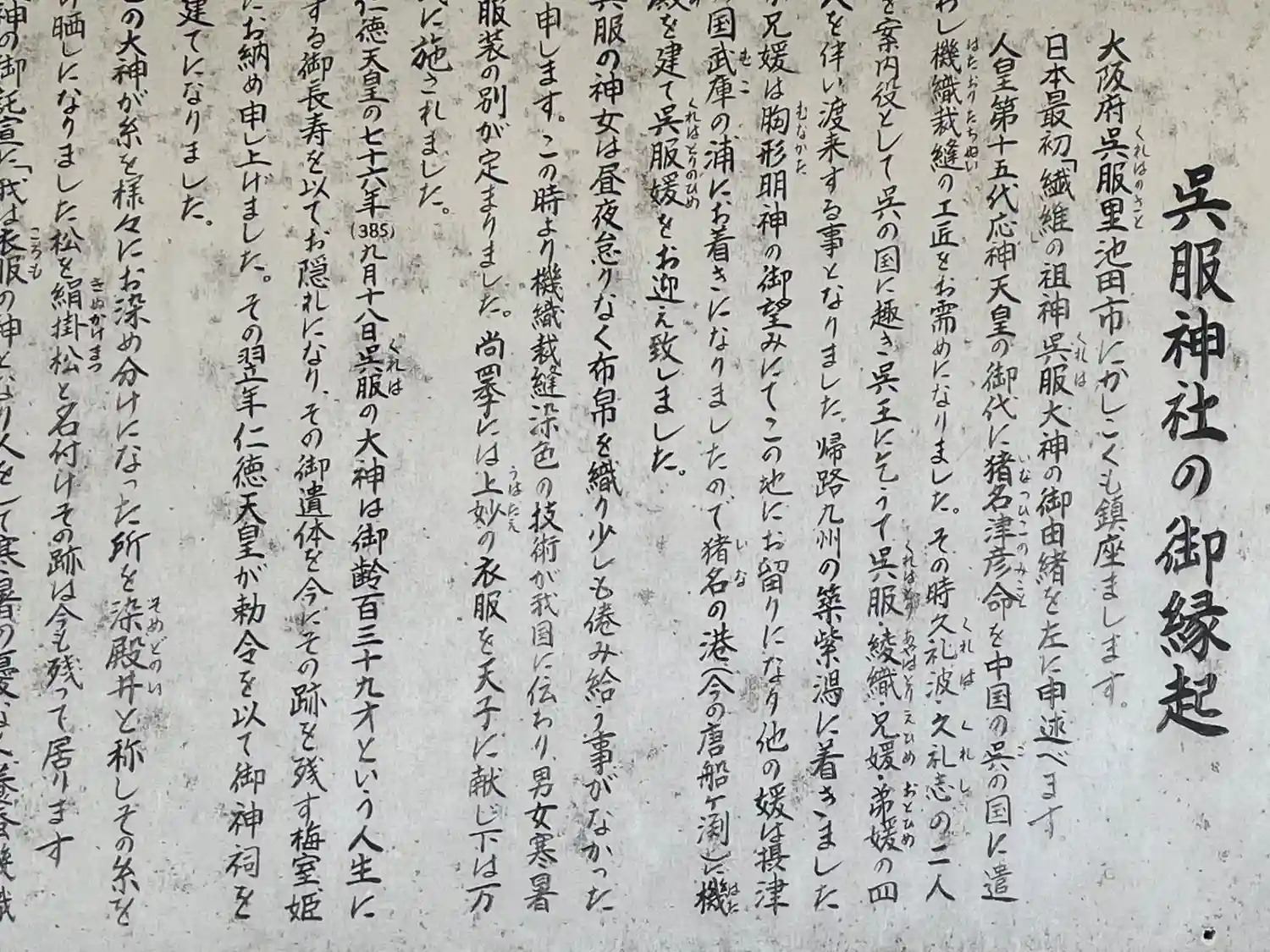 呉の国より呉服(クレハトリ)・穴織(アヤハトリ)という姉妹がこの地に住みつき、機織・栽縫の技術を伝…