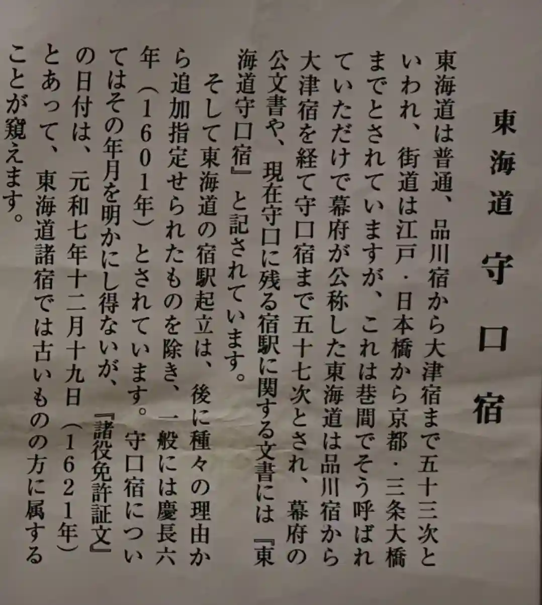 「東海道五十七次」説~守口市は五十七番目の「守口宿」……江戸時代の「宿駅制定証文」で、元和2(1616)年に守口宿が制定されたことが記されているとの事😲