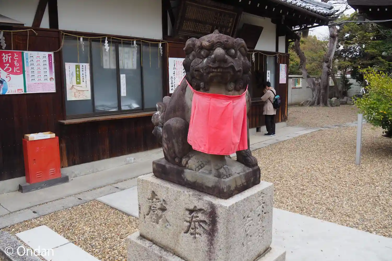 狛犬。左右紅白の前掛けをしていてかわいい。