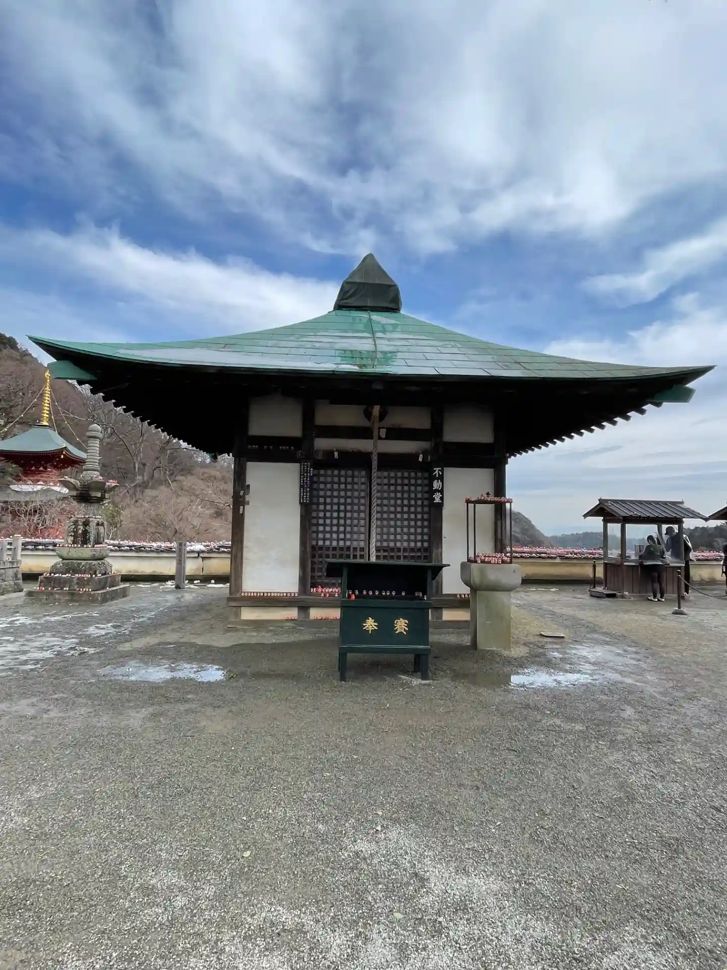 本堂前邪魔にならないよう柱の影でお勤めをし