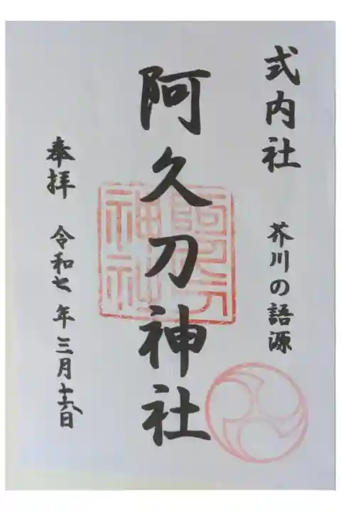 阿久刀神社へ到着。雨が降ったりやんだりで嫌な天気が続く日。あいにくの天気にも関わらず数組の親子連れがお参りされており、サンリオなどの子供向けお守りなどを拝受されておりました🤗境内は参道左側に摂末社が並んでおり、いずれも明治の神社整理でこちらに遷座されてきたお社のようです。よって同じ御祭神のお名前もちらほら😅合祀ではなくあくまで個々の神社として残しているのかもしれません。各社お参り後本殿をお参り。授与所にて御朱印を拝受いたしました🤗