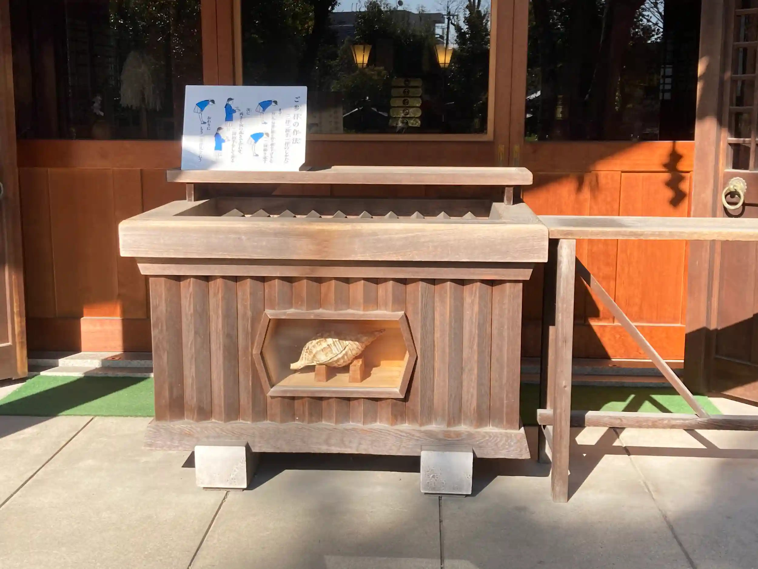 社殿の賽銭箱になぜか大きい貝殻がありました。