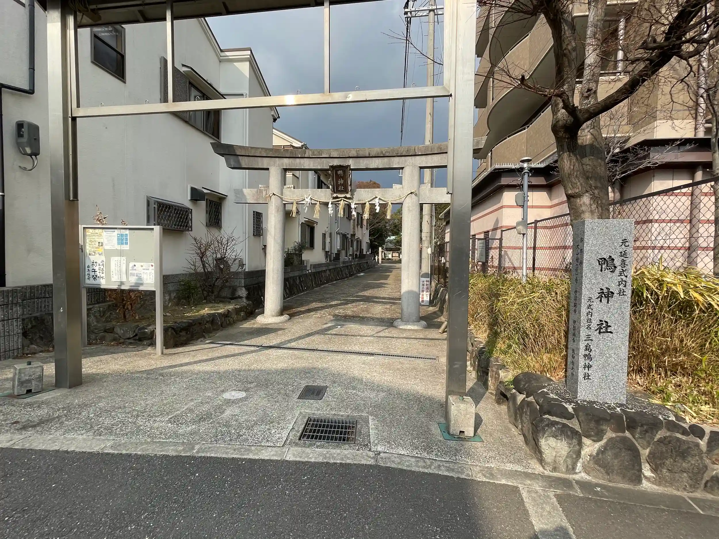 「元延喜式内社鴨神社」の石標。石鳥居を潜って参道を進んで、注連縄の鳥居をくぐり横に児童公園。