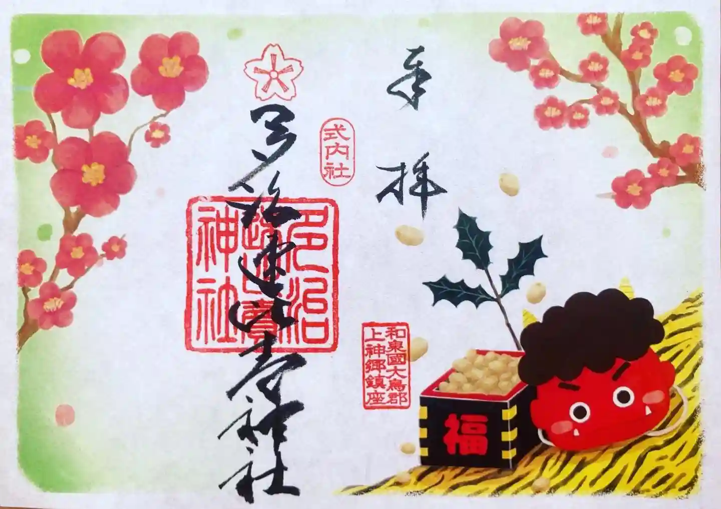今月は節分をモチーフに赤鬼のお面に柊・枡入りの豆を描き、季節の梅の花を添えました。