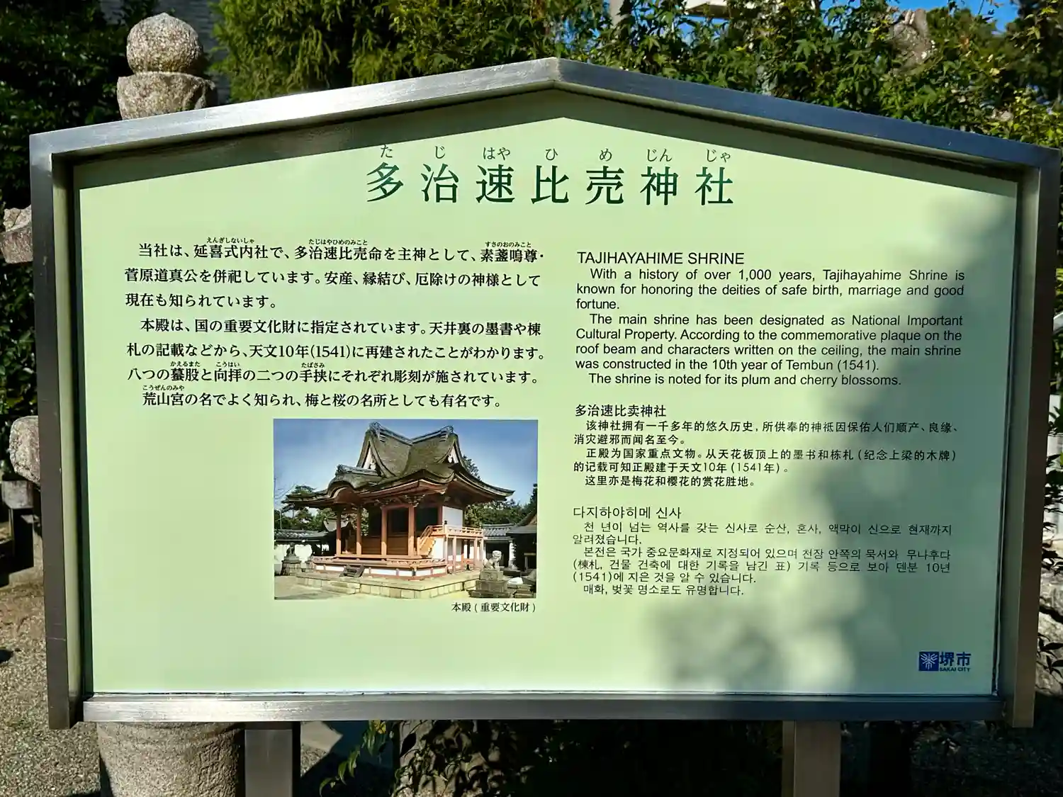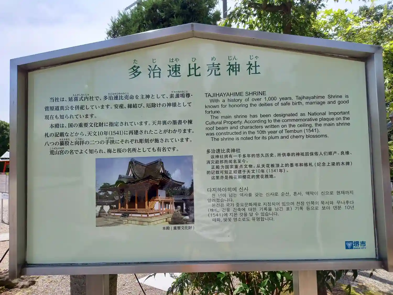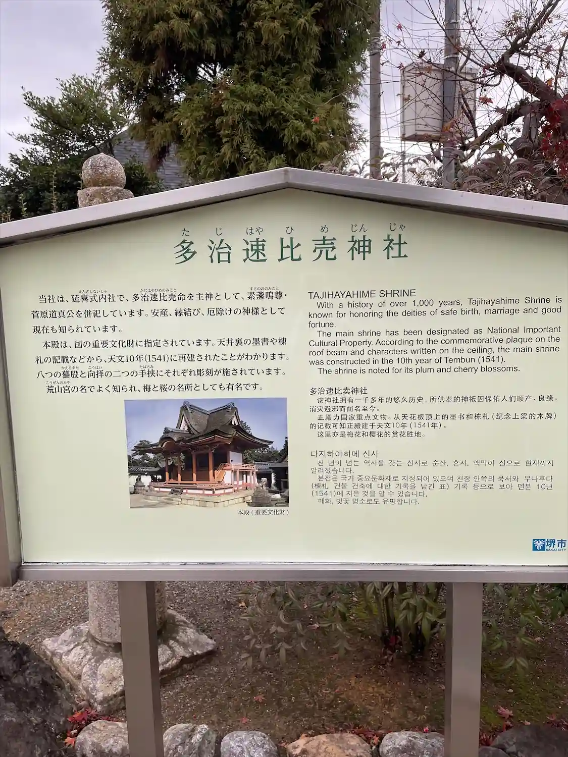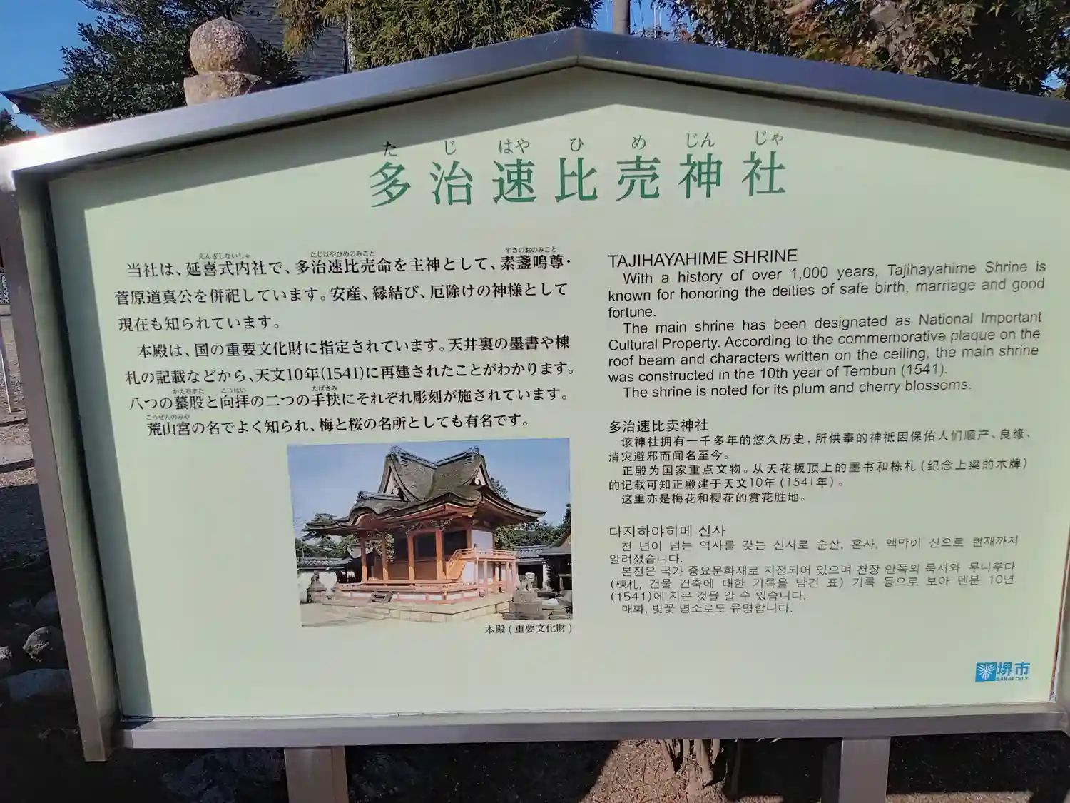 「たじはやひめじんじゃ」と読みます。堺市にある、安産、縁結び、厄除けの神様が祀られている神社です。…