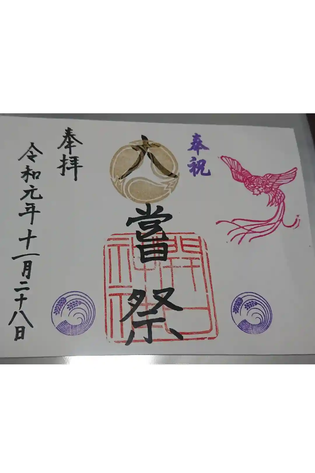 大嘗祭の記念御朱印も頂きました。大きくて御朱印帳には貼れないので、ファイルに保管