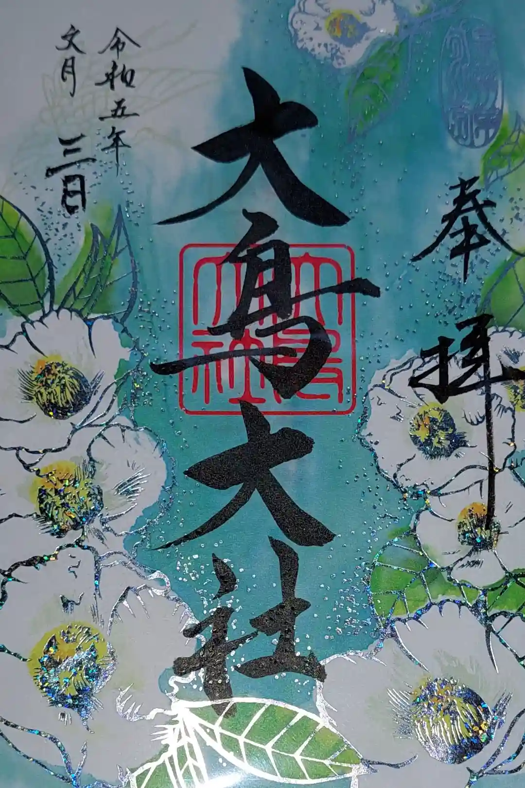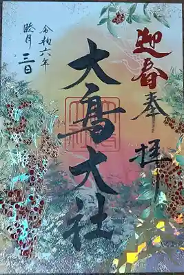 令和六年の最初を飾る限定朱印「大島の四 芋」は、初日が昇る瞬間に「松と南天」に彩 られた千種の社が金色に輝き、八寿の大島が