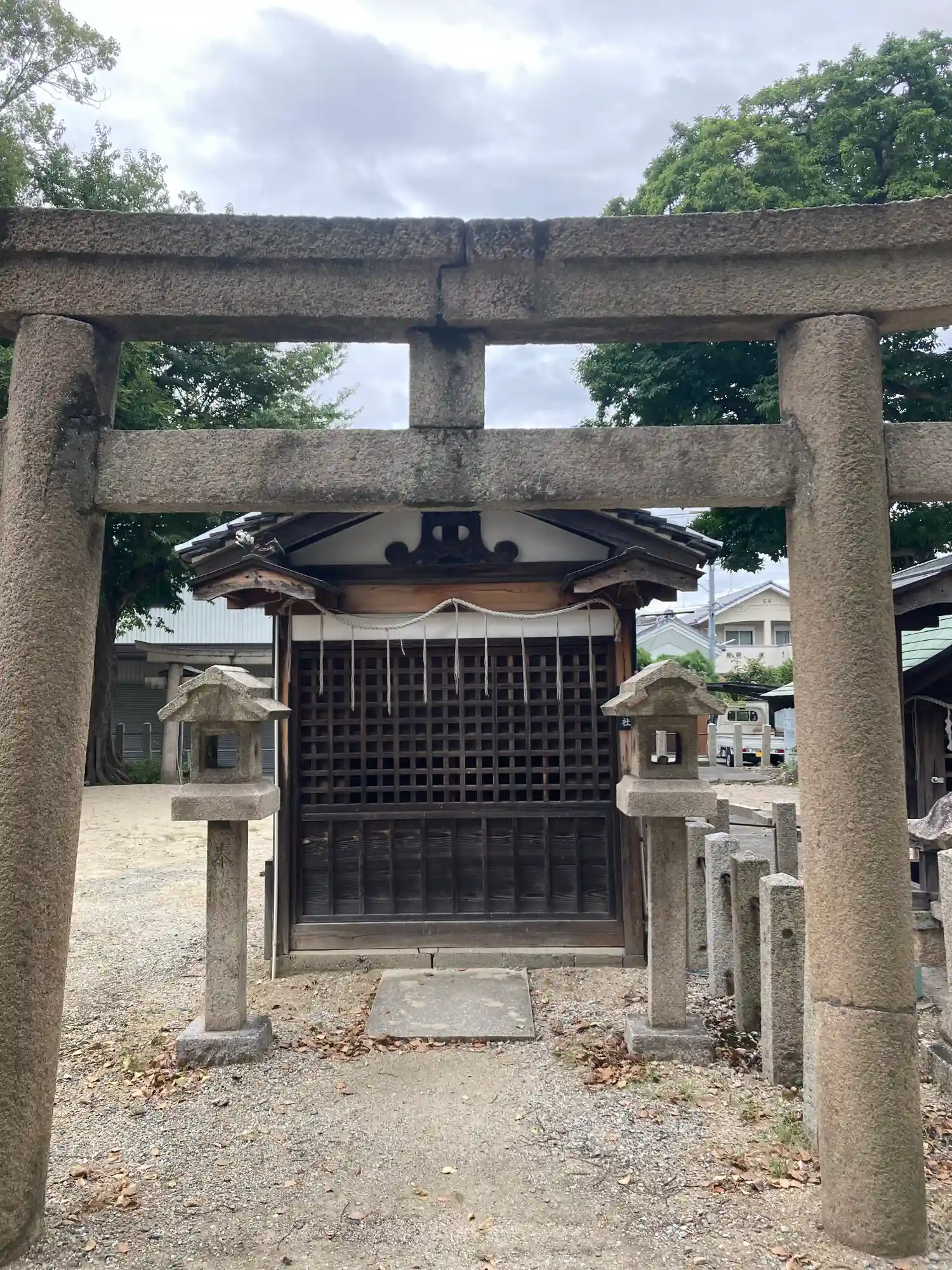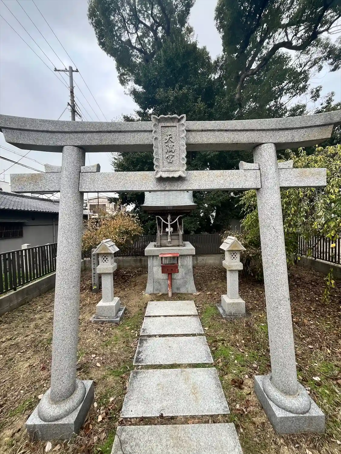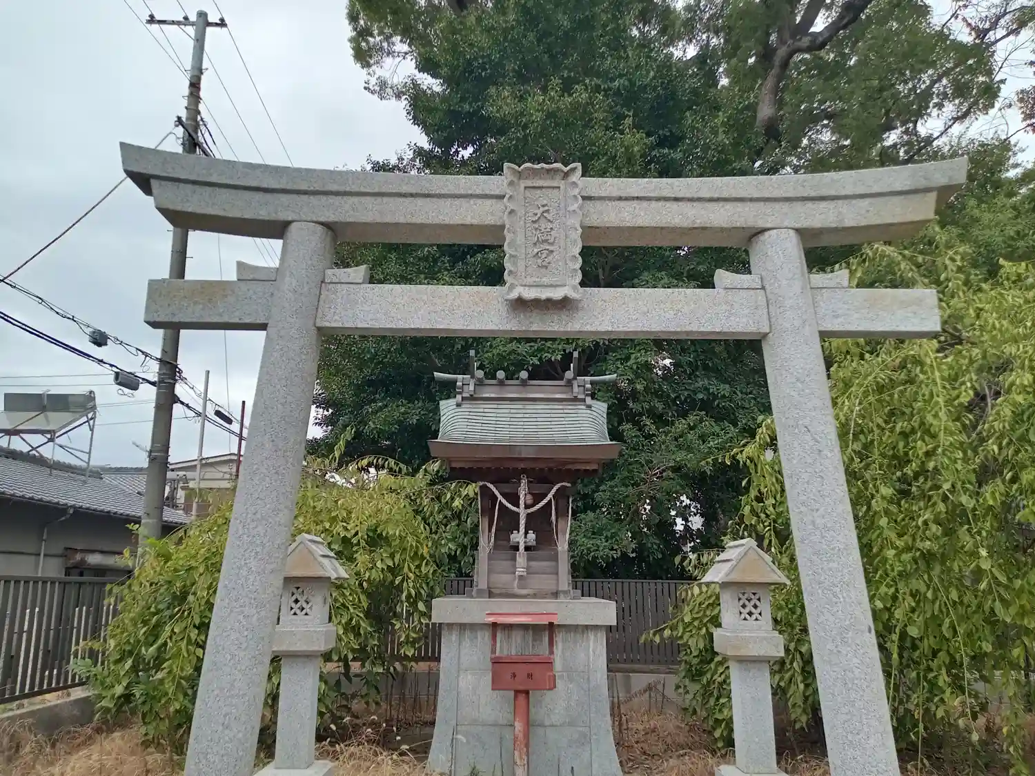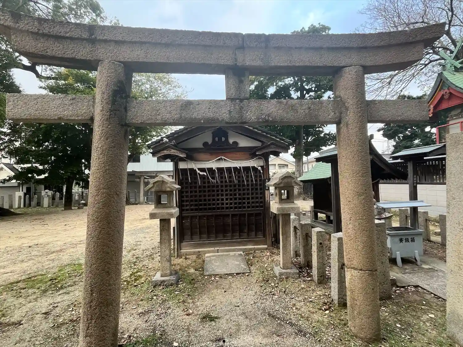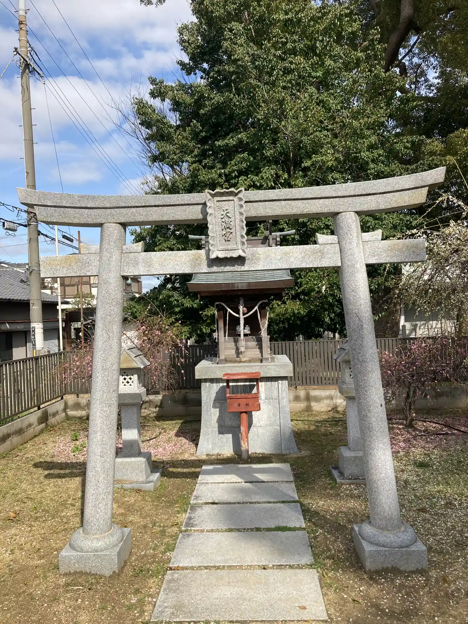 住宅地の中で、鮮やかな朱色の鳥居が一際映えます。