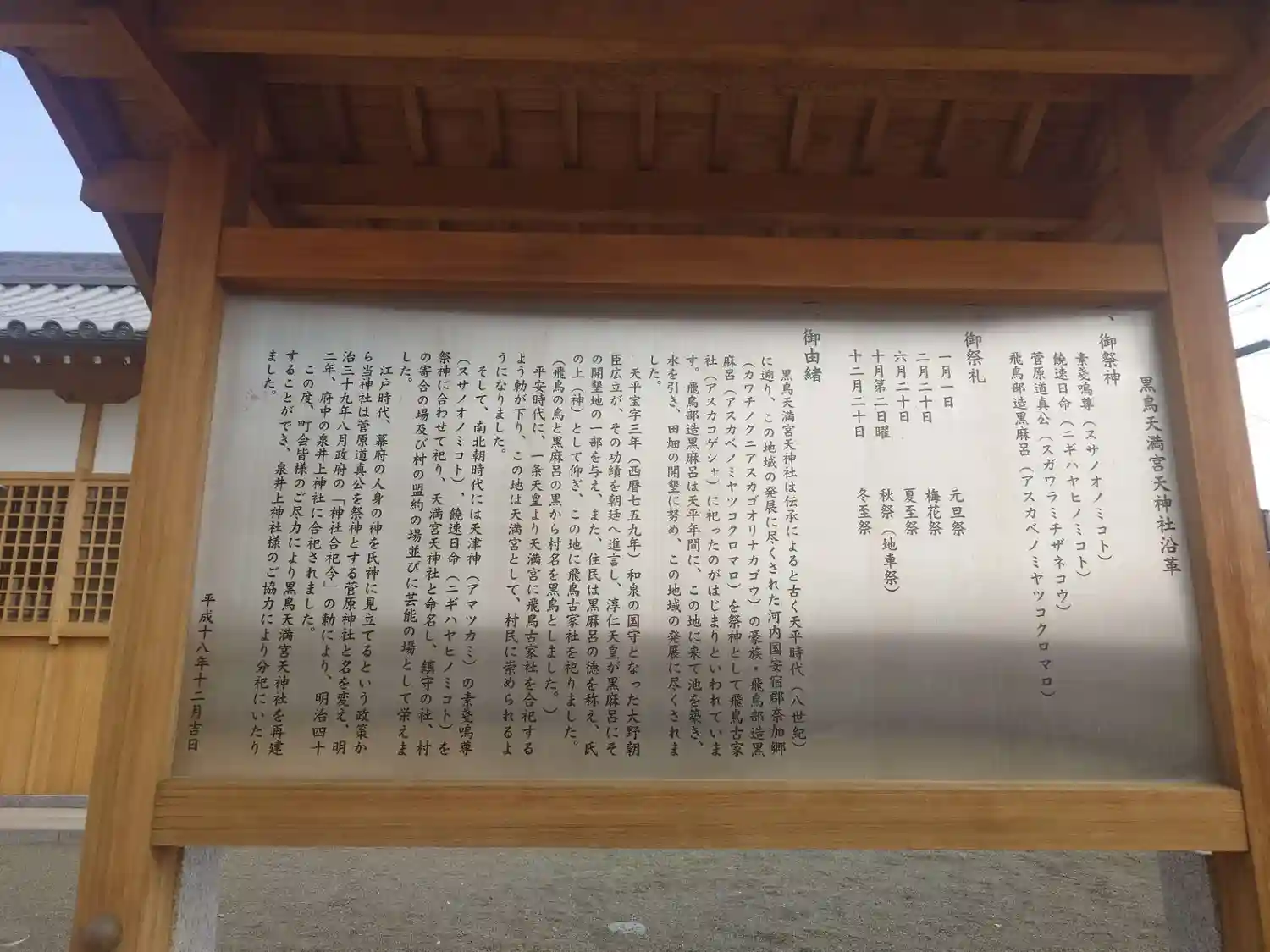 | ご由緒 | 黒鳥天満宮天神社は伝承によると古く天平時代(8世紀)に遡り、この地域の発展に尽くされた河内国安宿郡奈加郷の豪族・飛鳥部造黒麻呂を祭神として飛鳥古家社に祀ったのがはじまりといわれています。飛鳥部造黒麻呂は天平年間に、この地に行けを築き、水を引き、田畑の開墾に努め、この地域の発展に尽くされました。