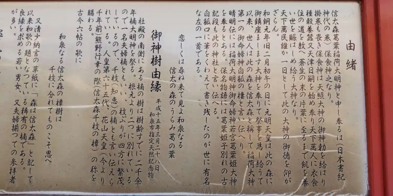 第65代花山天皇より『信太森千枝の樟』の称を賜られたとか。