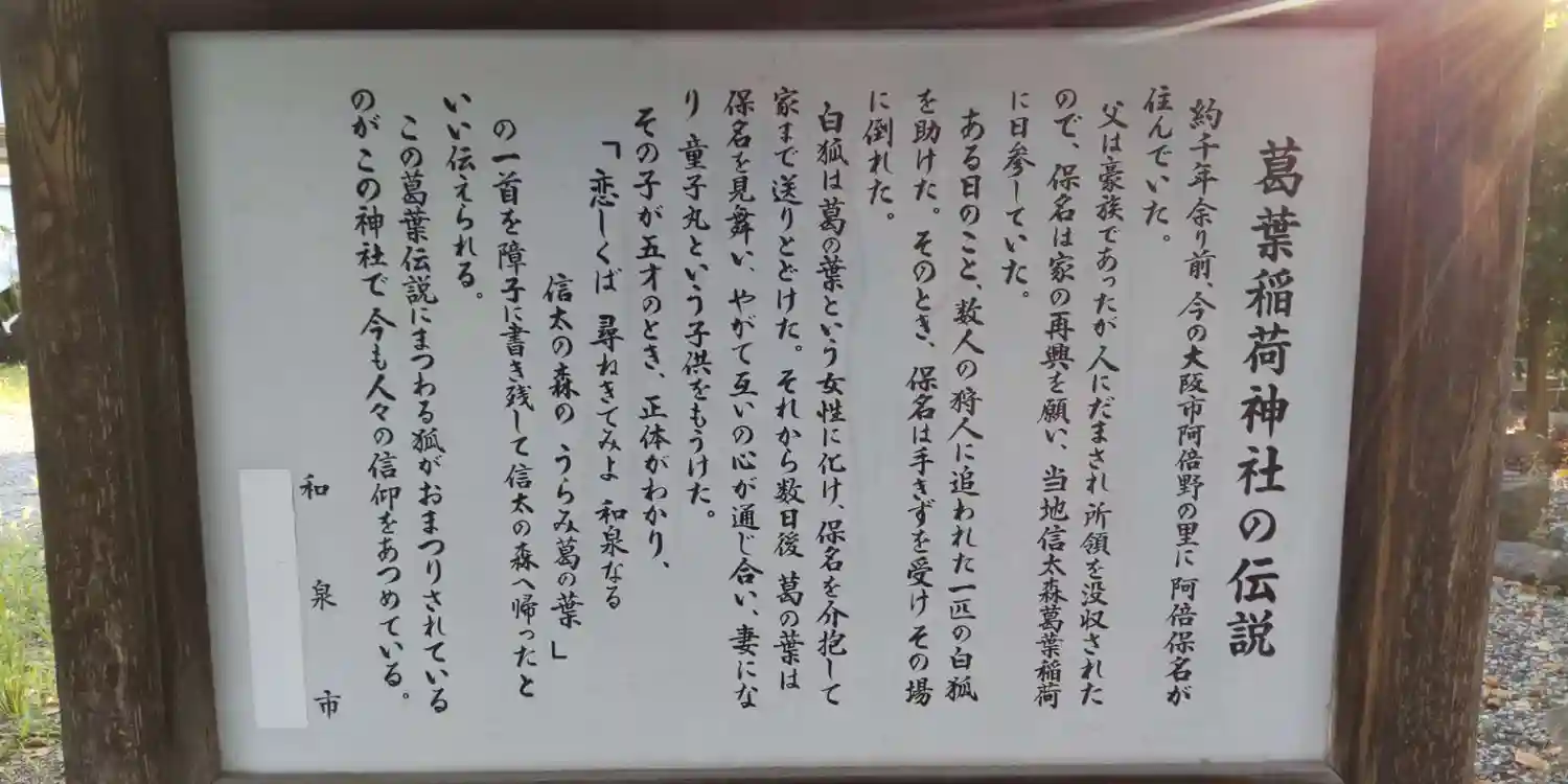 文楽にも登場する安倍保名と葛の葉姫との恋物語の言い伝えがある神社です。二人の子供は安倍晴明だそうで…
