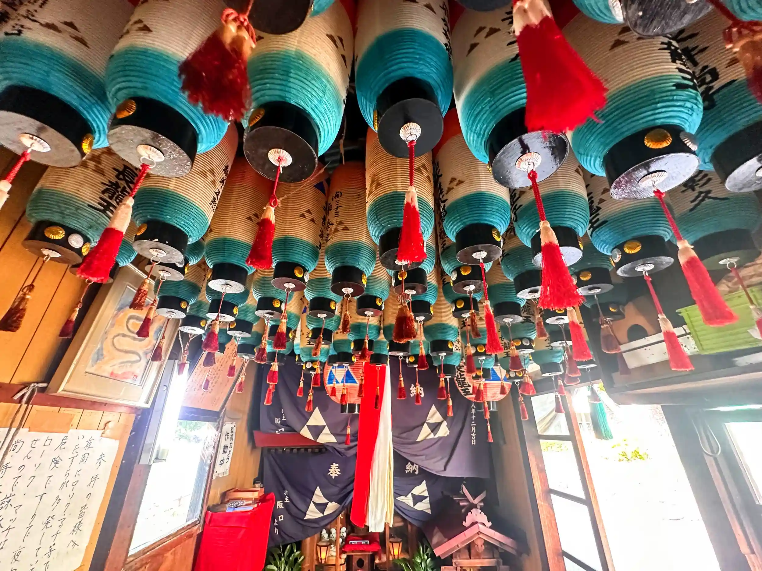 岸和田城の御堀のすぐ前に鎮座されています向かいは岸和田高校の正門。御本尊として黒長龍王という蛇の神様が祭られています。黒長龍王は、岸和田城の守り神です、拝殿の中には、龍神様の系図と小さな本殿があります、外には千亀利不動明王と観世音菩薩の像もありました。