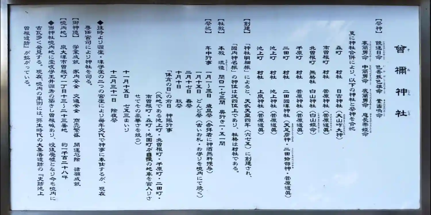 池上曽根遺跡に隣接し、曽根連の氏神として饒速日命を祖神としている。