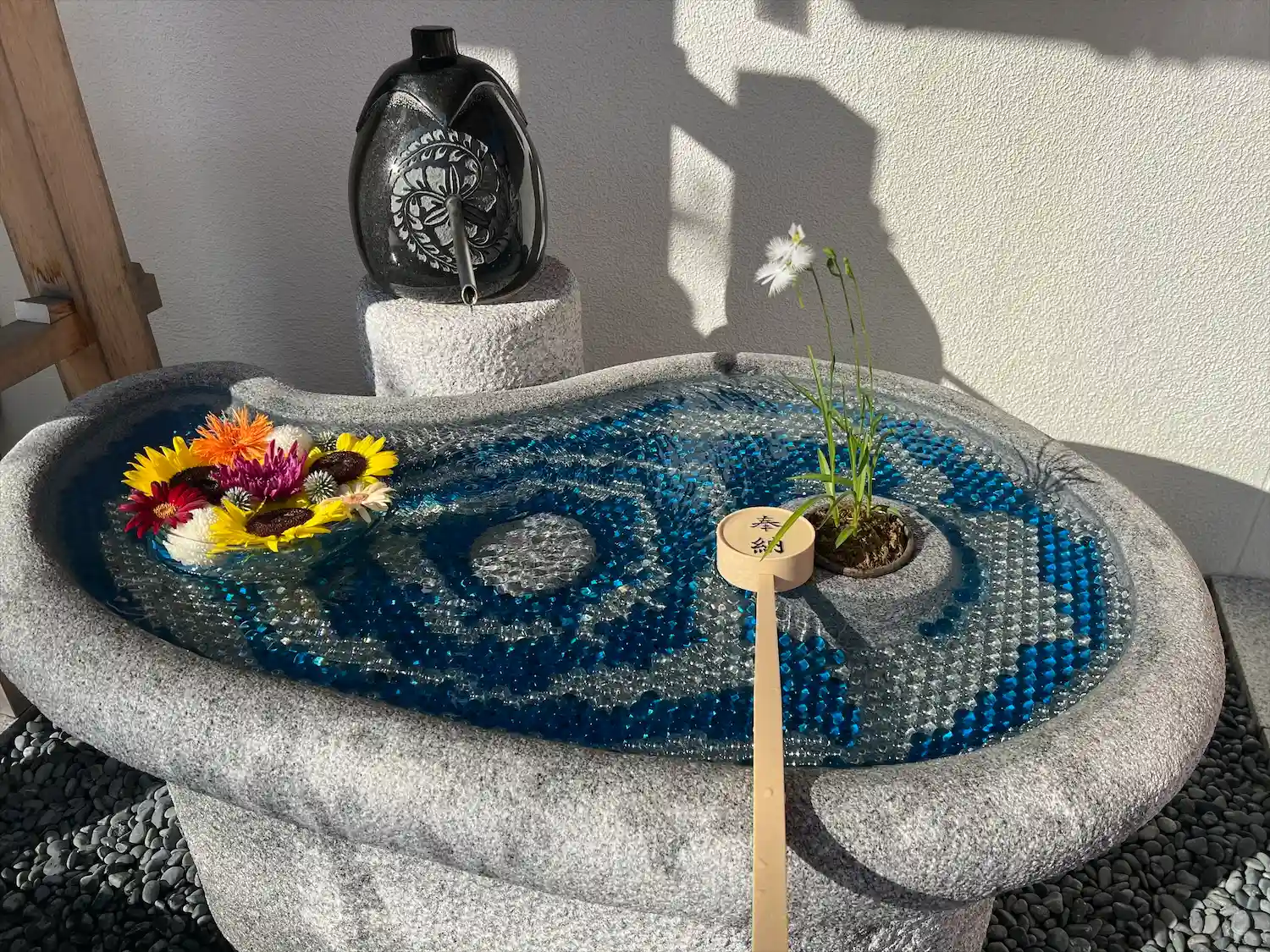 毎月始めに末社大宮稲荷神社の手水舎にビー玉花手水をご用意しています。