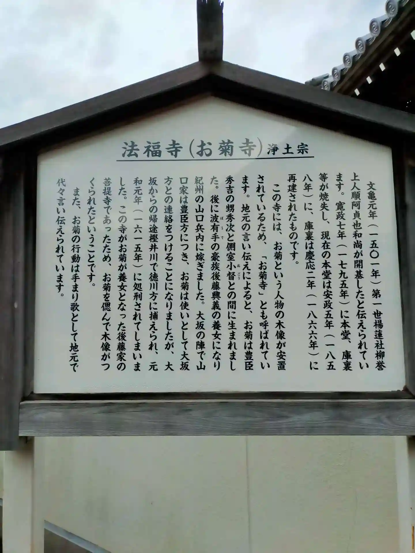浄土宗 楊柳山 西照院 法福寺さんです。豊臣秀次と側室小督との子、お菊の寺として有名です。1501年創建です。