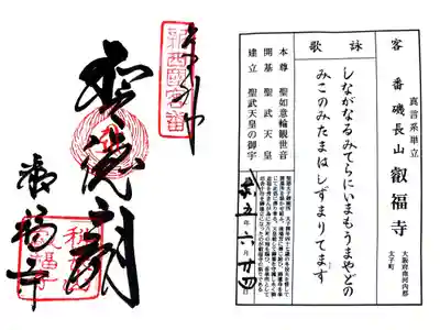 新西国三十三箇所霊場客番札所/仏塔古寺十八尊第2番札所/河内西国霊場第21番札所/聖徳太子遺跡霊場第6番札所/西山国師霊場第15番札所/河内飛鳥古社寺霊場第15番札所/神仏霊場巡拝の道大阪16番札所
