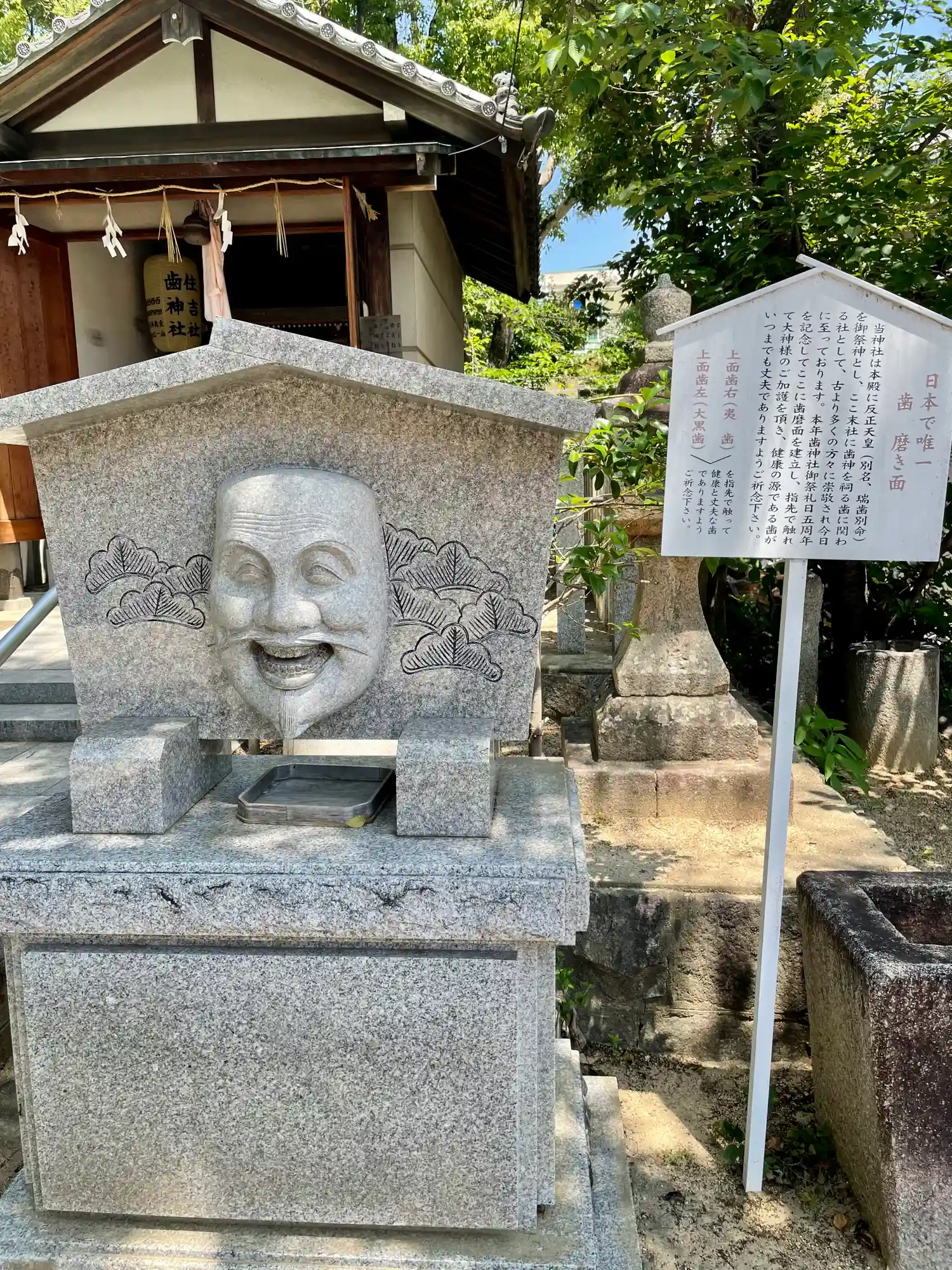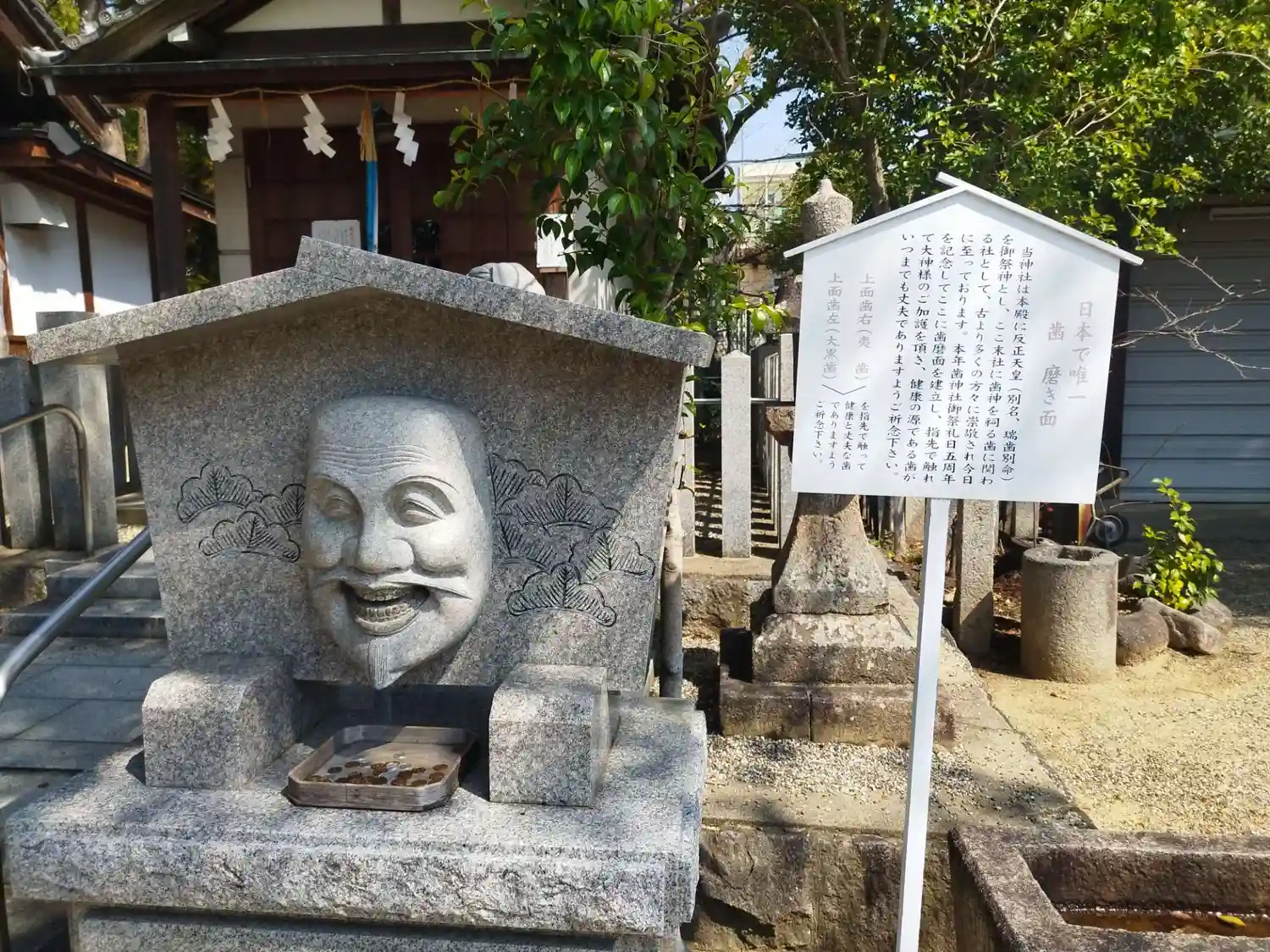 当社に祀られている反正天皇さまは幼い頃から歯並びがとても綺麗だったとされ、幼名では綺麗な歯を意味する「瑞歯別皇子」、和風諡号は「多遅比瑞歯別天皇」と生涯の名前として呼ばれています。その縁もあってこちらでは歯の神様を祀っており歯の丈夫さを祈願しています。