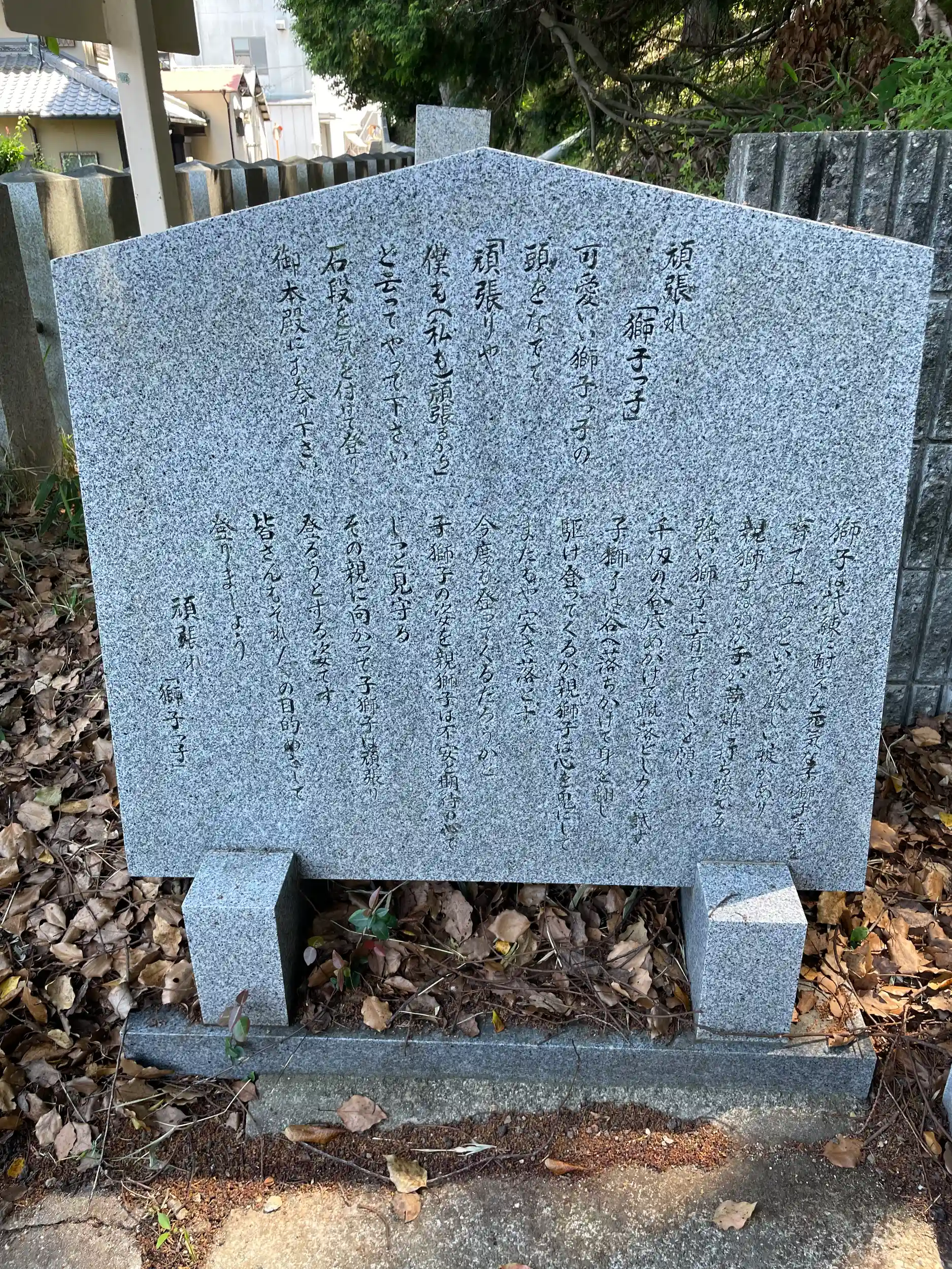 行ってみると、なんということでしょう!って感じの可愛い💕😍😍😍狛犬が!こんなやんちゃなお姿はたまりません!参拝者方面に向かず、2匹とも上を見上げていました。🤔調べてみたところ、この狛犬「獅子っ子」🦁と呼ばれていて、狛犬が立ち上がり、階段の上を眺めているその視線の先は階段の上の左側だけの狛犬らしき像だそうです。これは狛犬ではなく親獅子で、獅子は、子供を千尋の谷に突き落とし、試練に耐えた子だけを育てあげるという情景を表しているとか。あの北斗の拳で、ラオウがトキを抱えてリュウケンのもとへ登ってくるという場面が思い浮かびました!😅あの時のラオウはカッコ良かったですよね。って、そこはさておき、獅子っ子のように、高い目標をクリアするために、目的を目指して登ろうという願いが、この像に込められているそうです。🥹