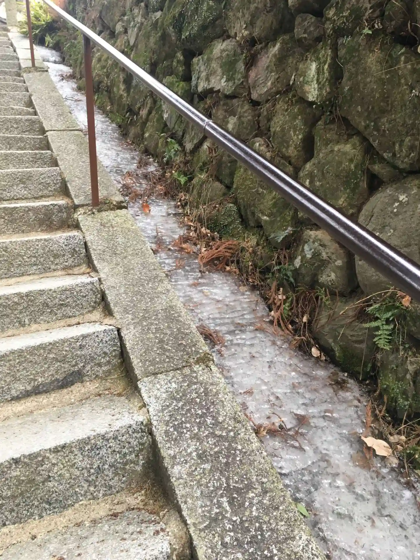 本堂へ登る直前の階段の側溝を流れる水までも凍りついている。参道も氷柱があちこちに下がっている。