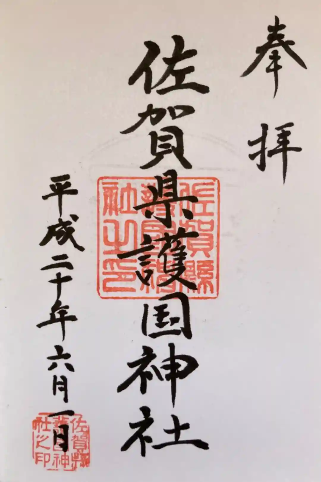 真ん中に佐賀縣護國神社と書かれ、真ん中と左下に佐賀縣護國神社の印が押されています。 | |||